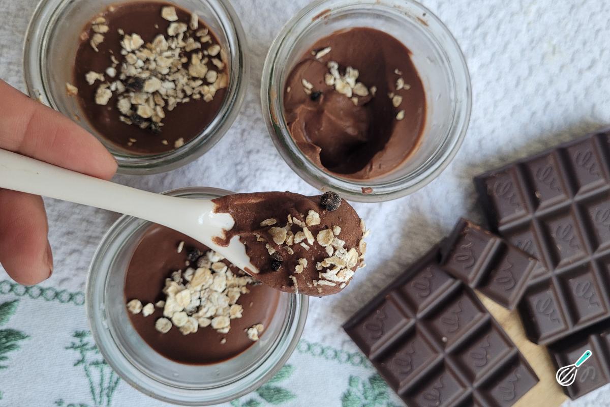 Sirva imediatamente ou deixe na geladeira até a hora de servir. Se quiser, ainda pode finalizar com toppings da sua preferência, como amêndoas, castanhas, nozes picadas, nibs de cacau, flor de sal. Aqui coloquei uma misturinha de flocos de aveia com pimenta preta que traz uma leve picãncia e contrasta muito bem com o doce do chocolate.