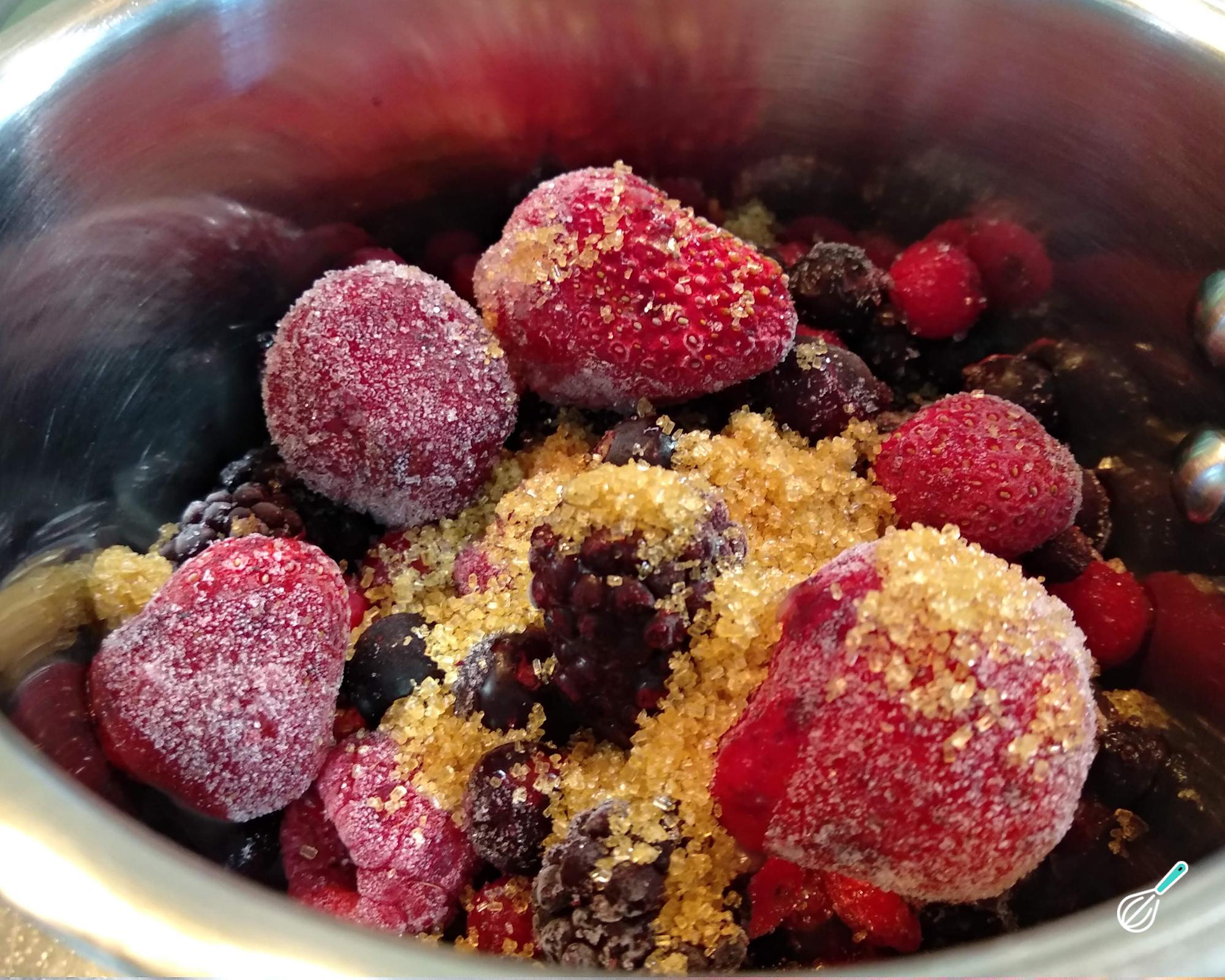 Dica: Neste caso usei um mix de frutas vermelhas congeladas. Se você estiver usando frutas vermelhas frescas adicione 1 colher de sopa de água na panela.