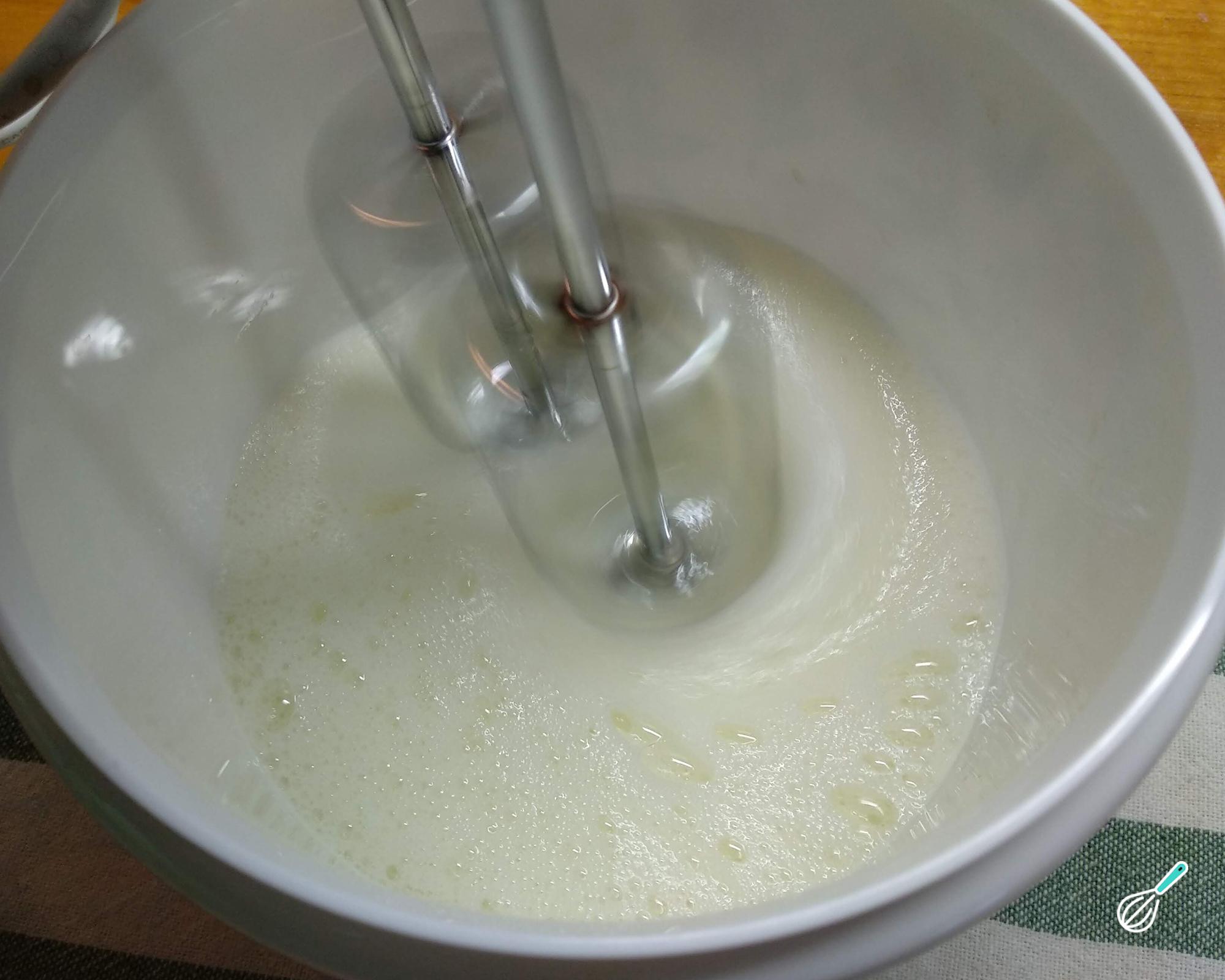 Separe as gemas das claras e bata as claras de ovo até ficarem bem crescidas e firmes. Junte as gemas e bata até misturar.
