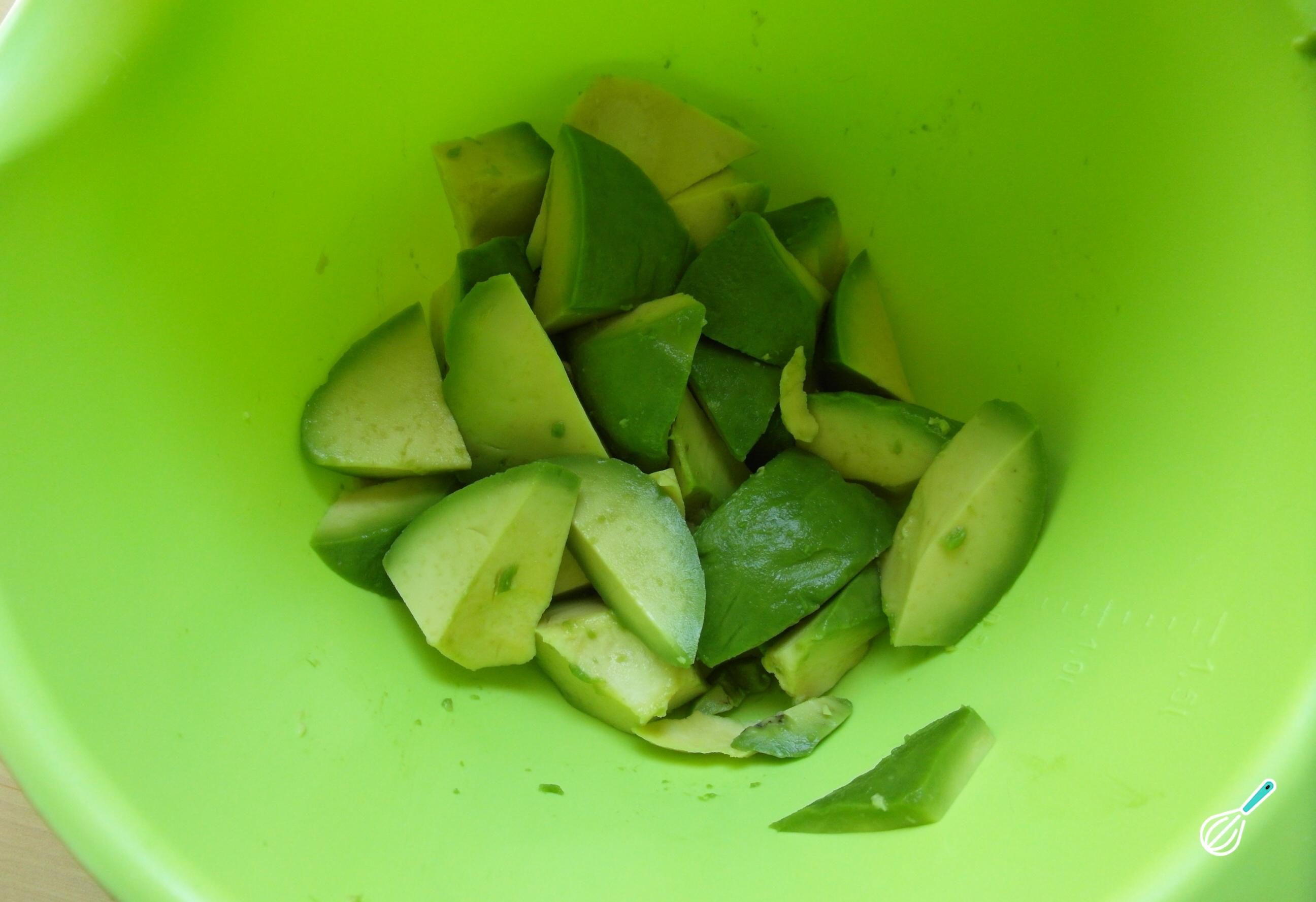 Descasque e corte o abacate em pedaços. Coloque em um recipiente fundo (caso use o mixer) ou no copo do liquidificador.