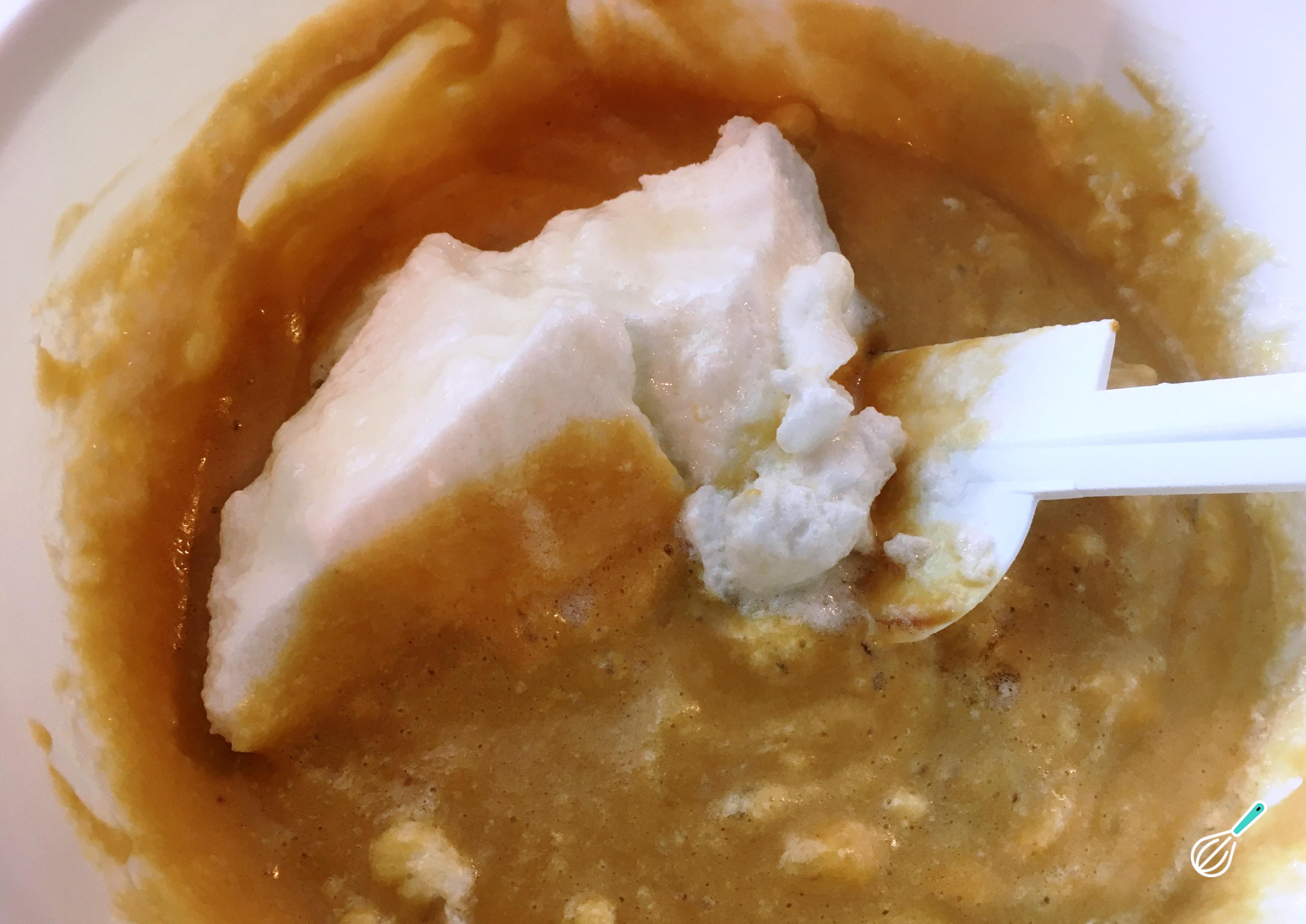 Adicione o merengue de açúcar e claras aos poucos na mistura anterior, encorporando lentamente e com movimentos envolventes, de preferência com uma espátula ou fouet, e sem bater.