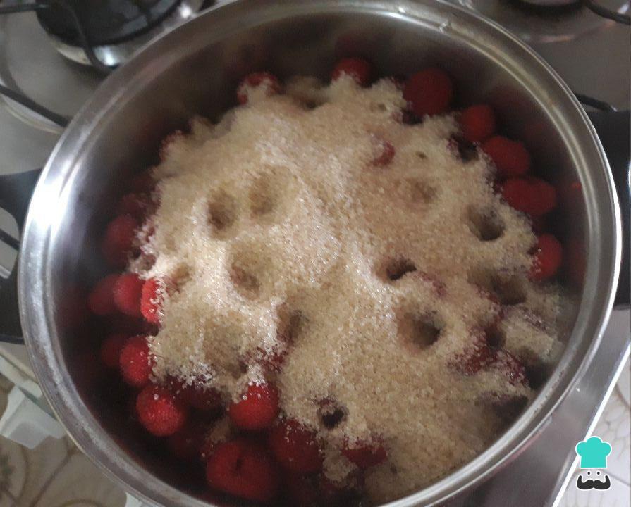 Coloque 500 gramas de framboesas em uma panela, acrescente o açúcar e leve ao fogo médio. Fique mexendo até ferver, depois baixe o fogo e deixe cozinhar por 15 minutos, mexendo de vez em quando, até as framboesas ficarem bem macias e desmanchando.