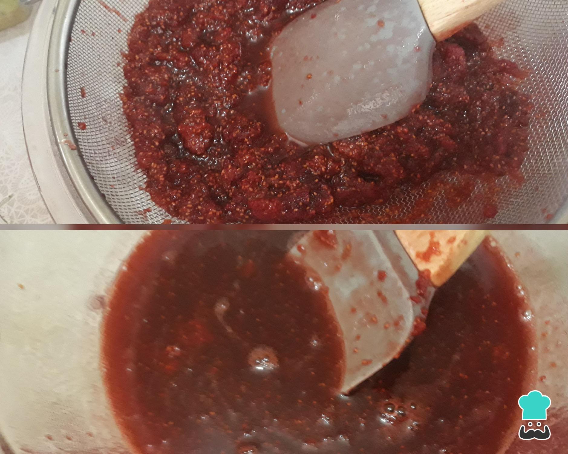 Passe a mistura de doce de framboesa ainda quente por uma peneira, para filtrar as sementinhas, e reserve até amornar ou ficar em temperatura ambiente.