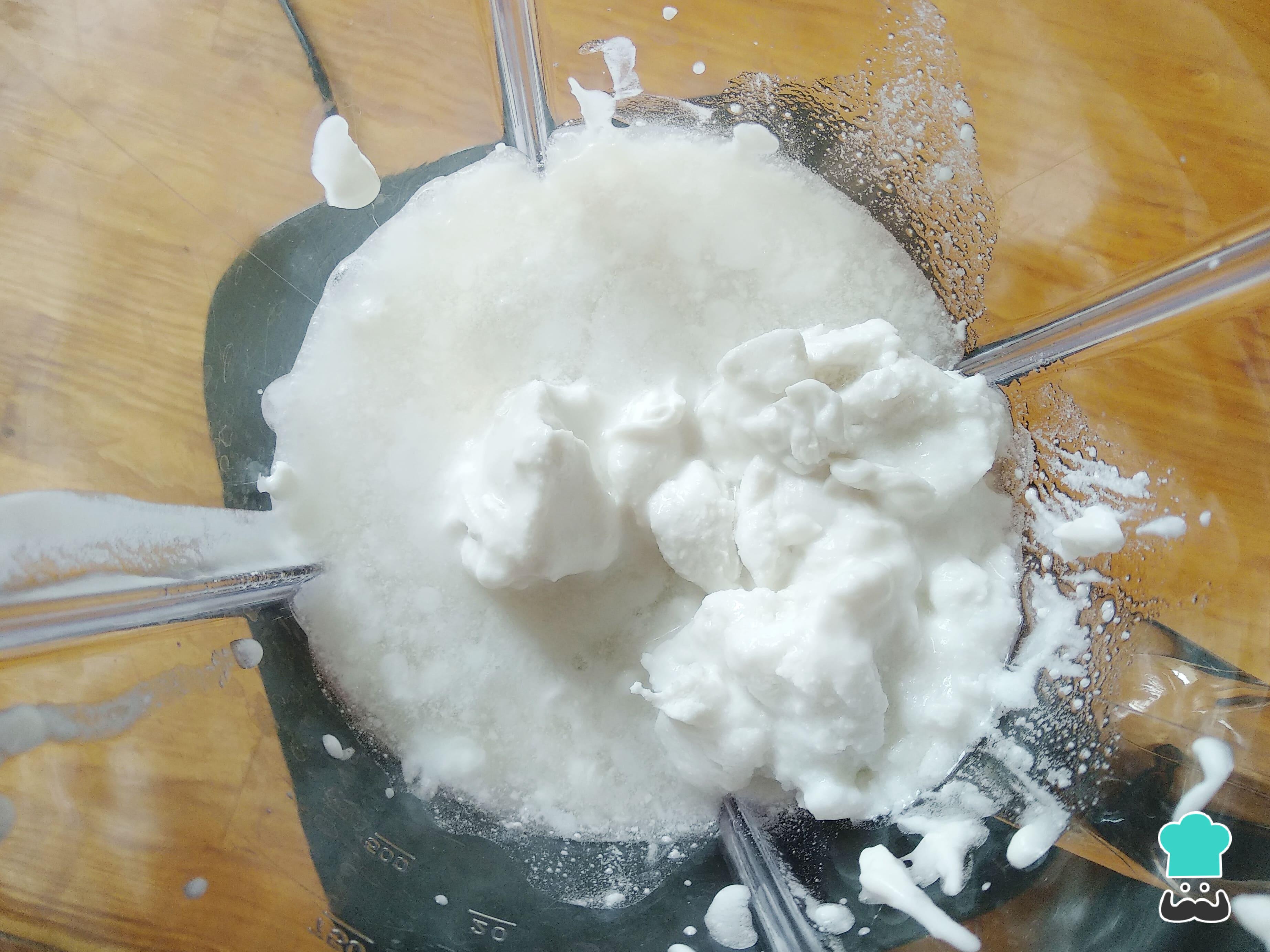 Preparar a mousse sem lactose é tão fácil quanto preparar a mousse comum! Comece por colocar o creme de coco no liquidificador e também o leite condensado de coco.