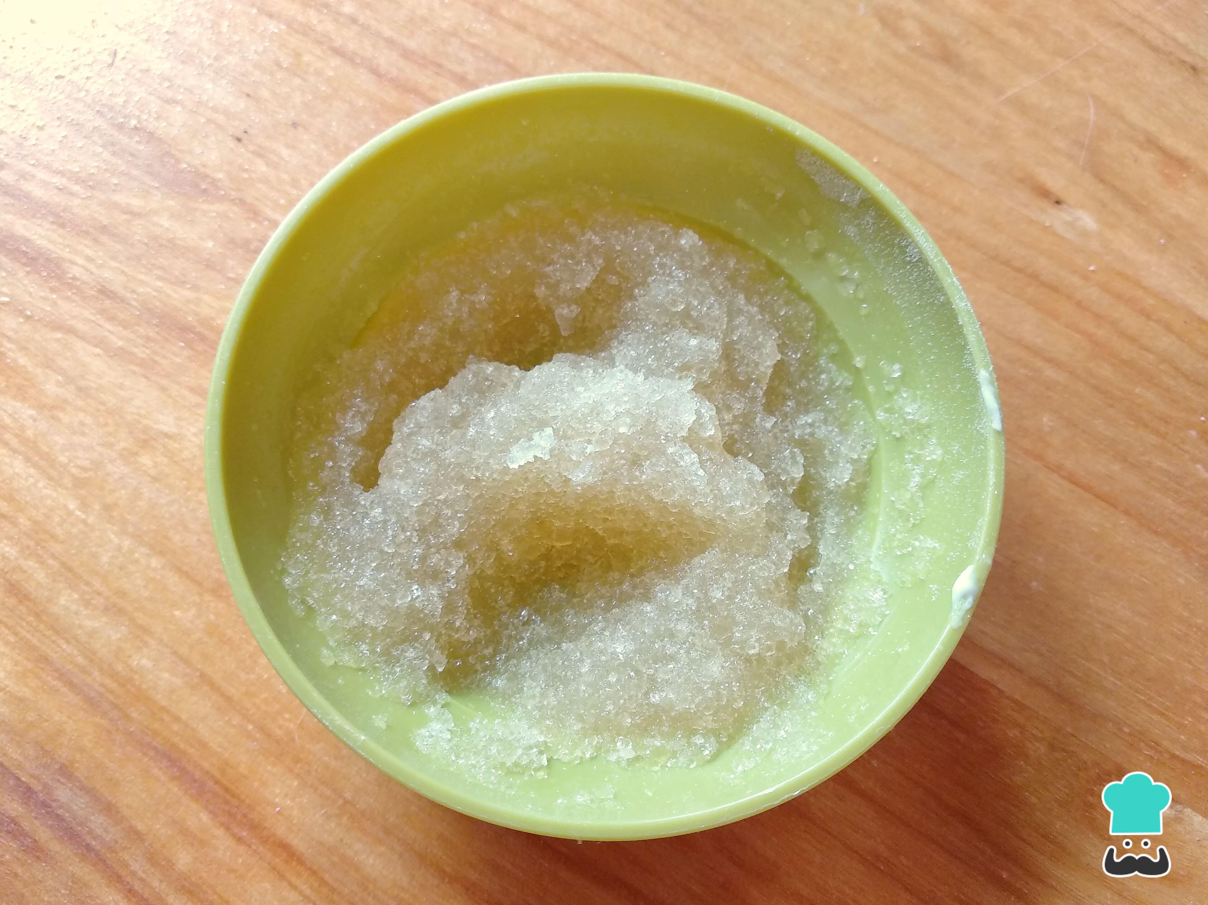 À parte, prepare a gelatina em pó. Para isso, basta dissolver a gelatina com 1 colher de sopa de água e esperar alguns segundinhos para que fique durinha. Depois, esquente ligeiramente no microondas, em temperatura baixa e por 30 segundos ou até derreter.