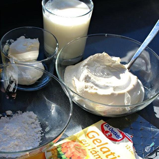 À parte hidrate a gelatina em um pouco de água fria. Esquente o restante leite até ficar morno e, quando a gelatina estiver mole, acrescente ao leite e dissolva. Adicione o leite à mistura de queijos e mexa.