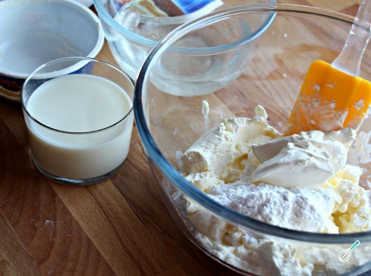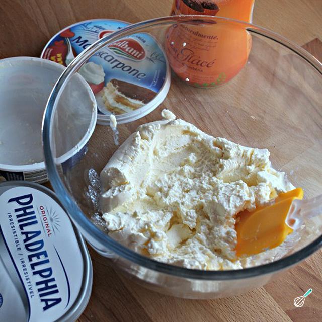 O primeiro passo é preparar o mousse de marcarpone: comece por misturar os dois queijos em um tigela, acrescente o açúcar de confeiteiro e metade do leite, e mexa até incorporar tudo muito bem.