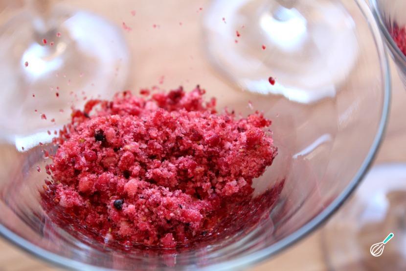 Para montar o doce, coloque um pouco das frutas vermelhas esmagadas no fundo de um copo.