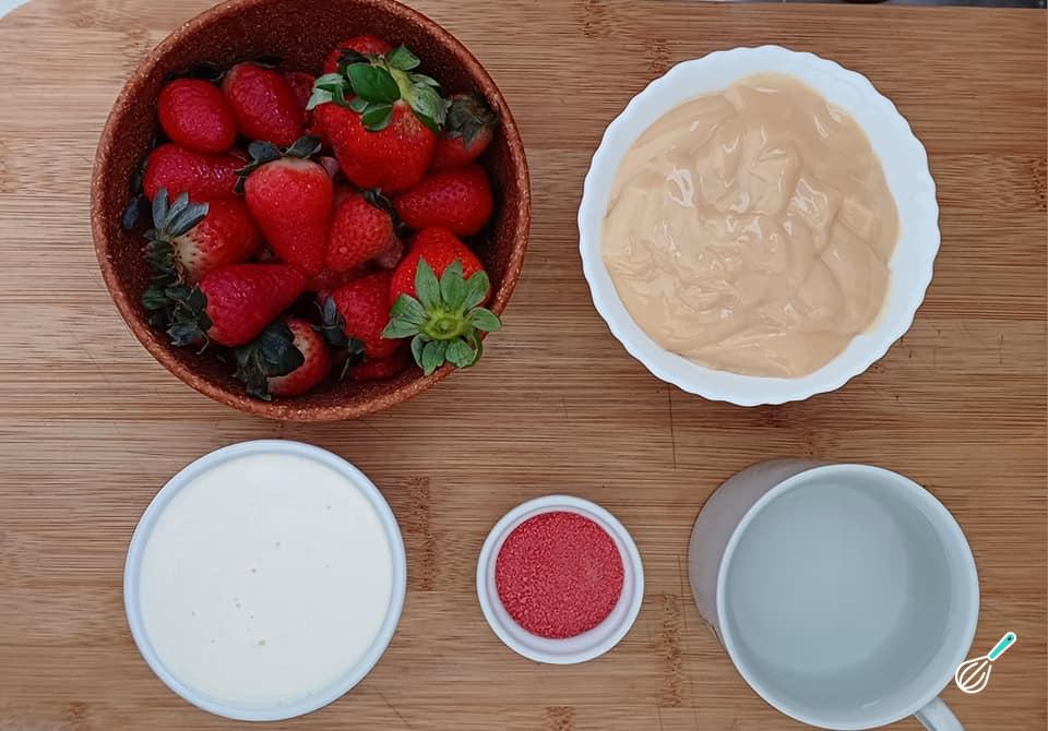 Separe os ingredientes necessários para o preparo da receita de mousse de morango fácil. Lave e higienize bem os morangos.