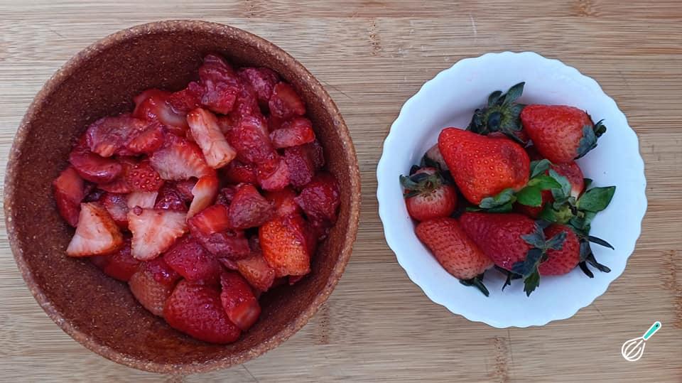 Pique os morangos, retire as folhinhas e reserve alguns para decoração, se quiser!