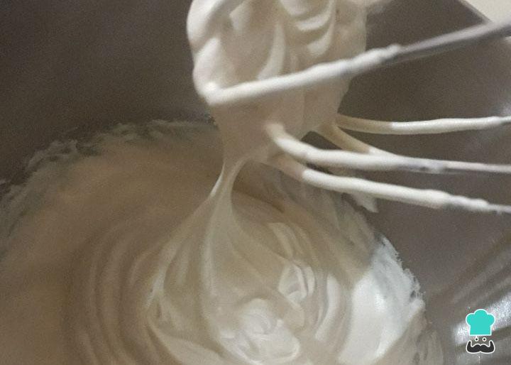 Em uma batedeira coloque as claras e bata. Após estarem em ponto de neve acrescente, uma a uma, as colheres de açúcar até formar um merengue firme como na foto.