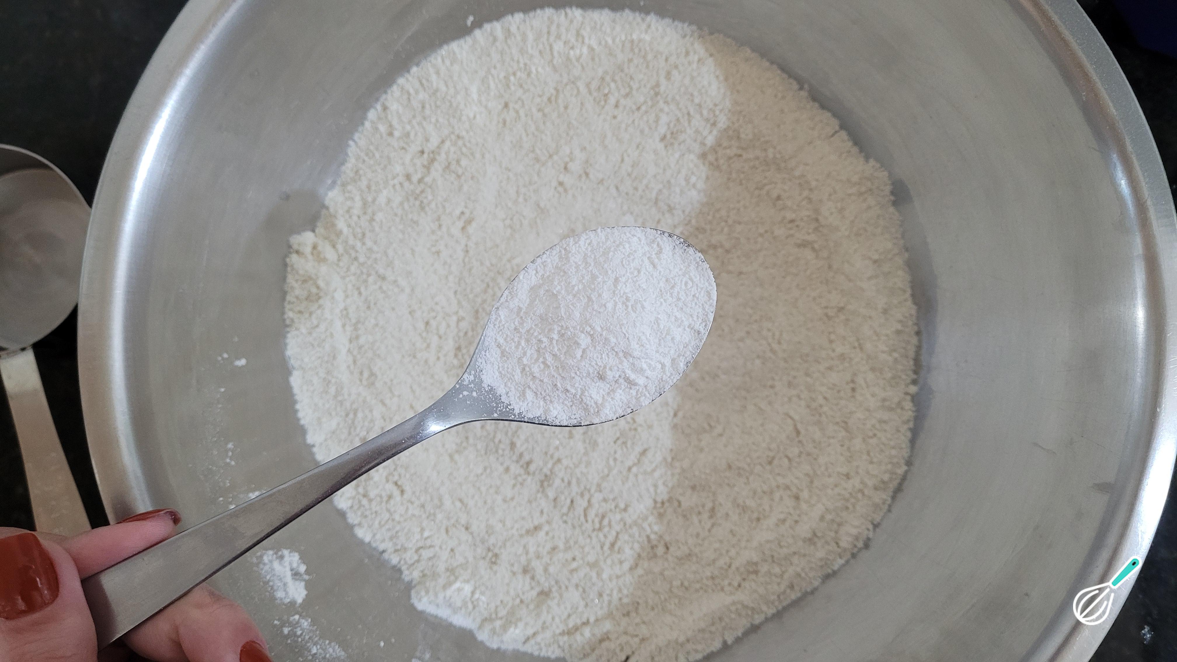 Em um recipiente, coloque a farinha de trigo, o açúcar, o fermento e o bicarbonato. Misture bem.