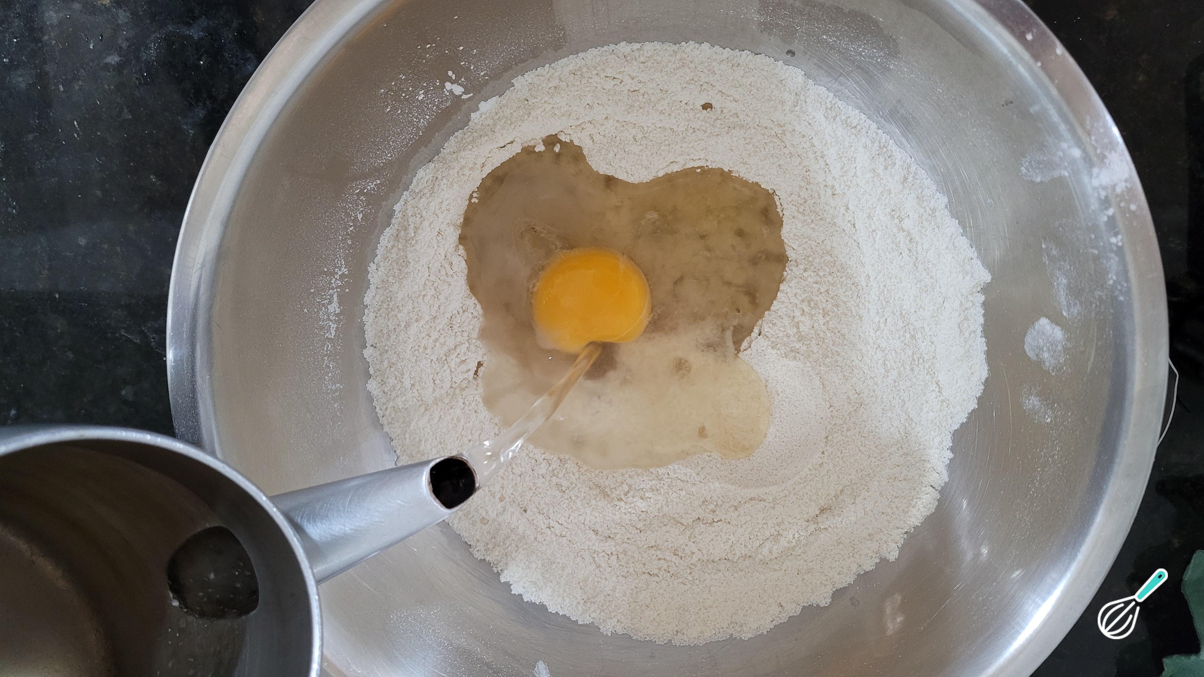 Acrescente o ovo, a água morna e mexa para que fique homogêneo.