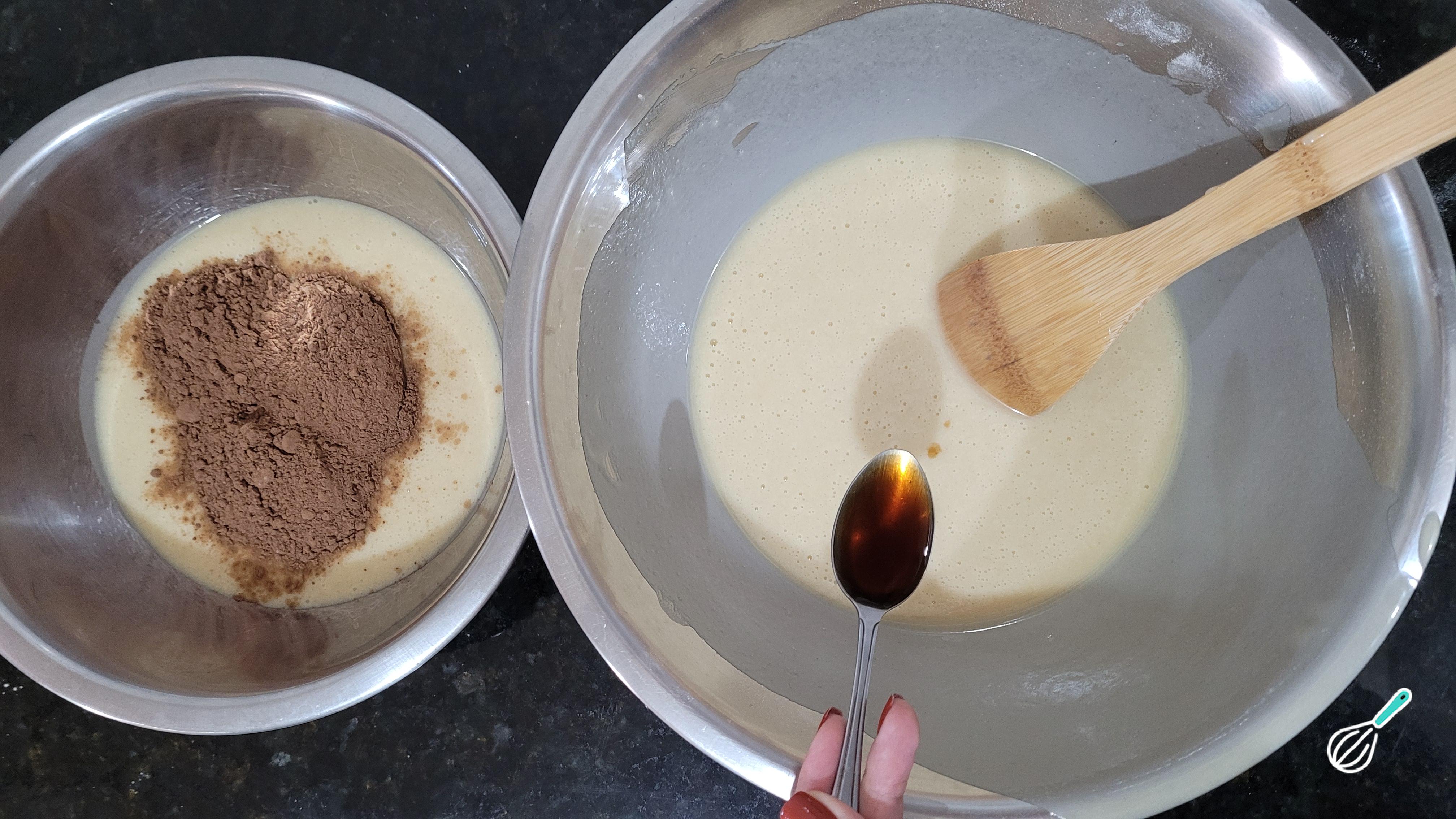 Separa a massa em dois recipientes, com a mesma quantidade. Em um, acrescente o chocolate em pó, e no outro a essência de baunilha.