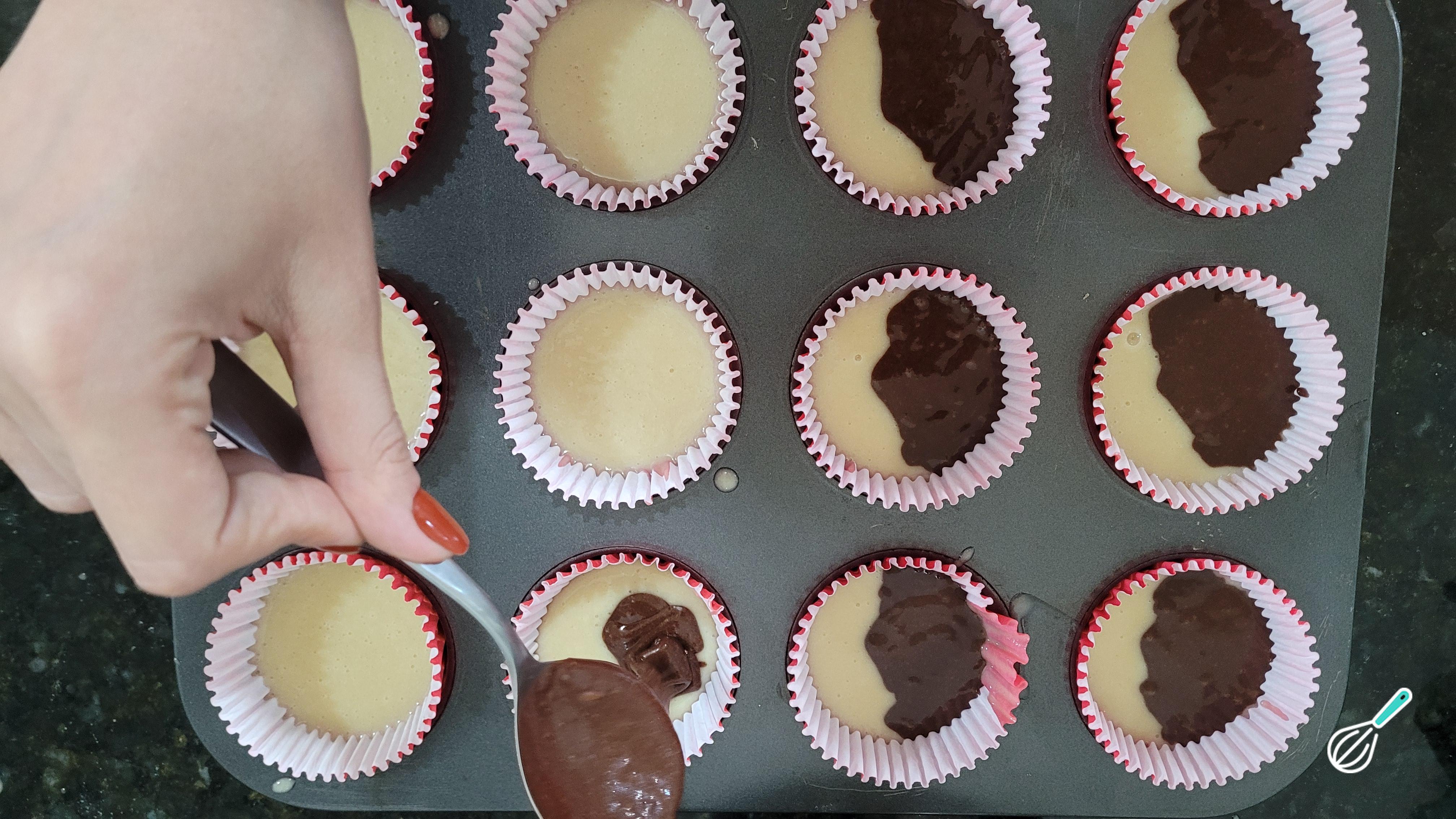 Disponha as forminhas na forma de cupcake. Coloque 3 colheres de sopa da massa branca e 1 de chocolate.