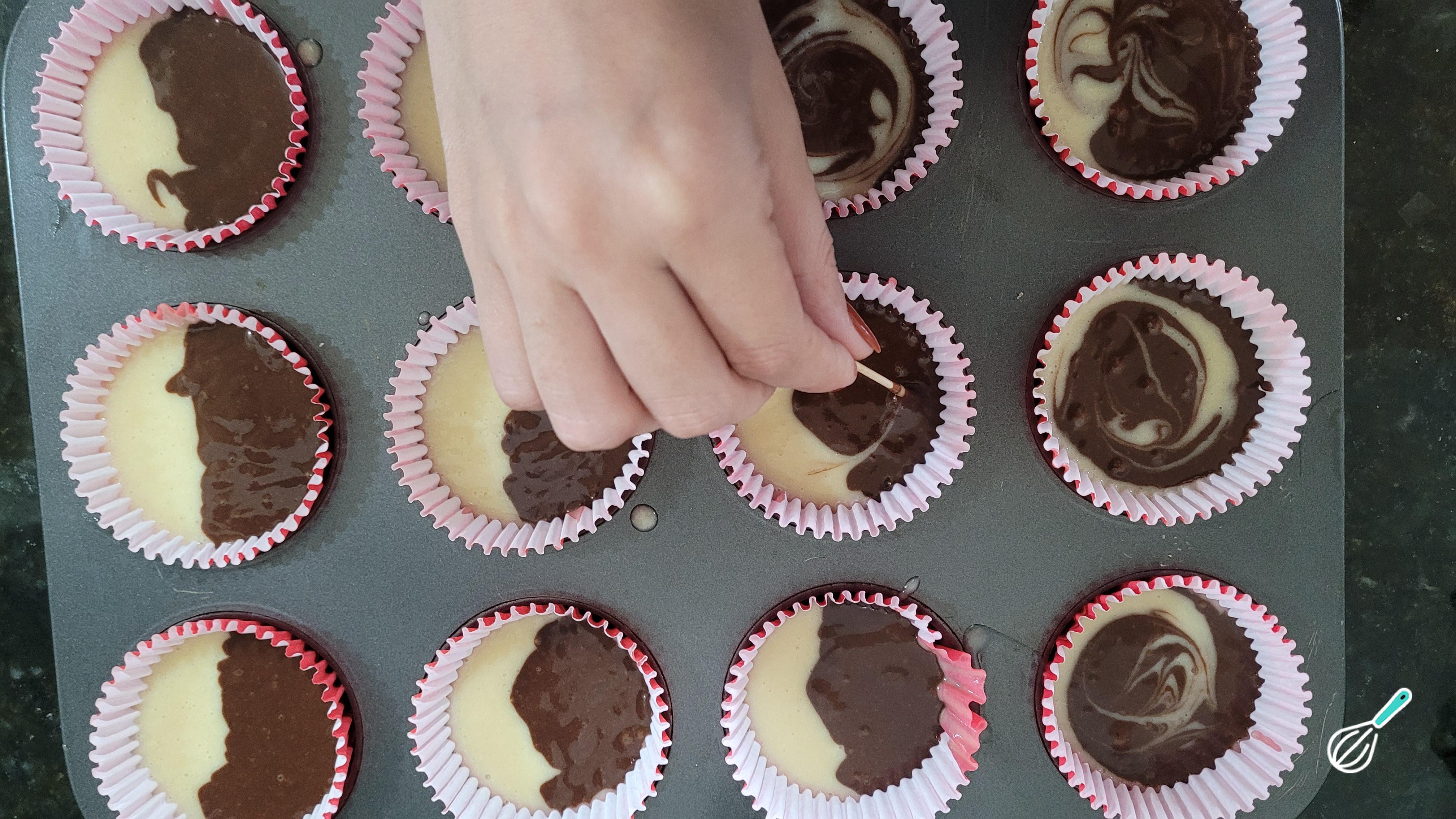 Confira abaixo como é fácil fazer esse muffin de baunilha (mesclado com chocolate) por aí também!