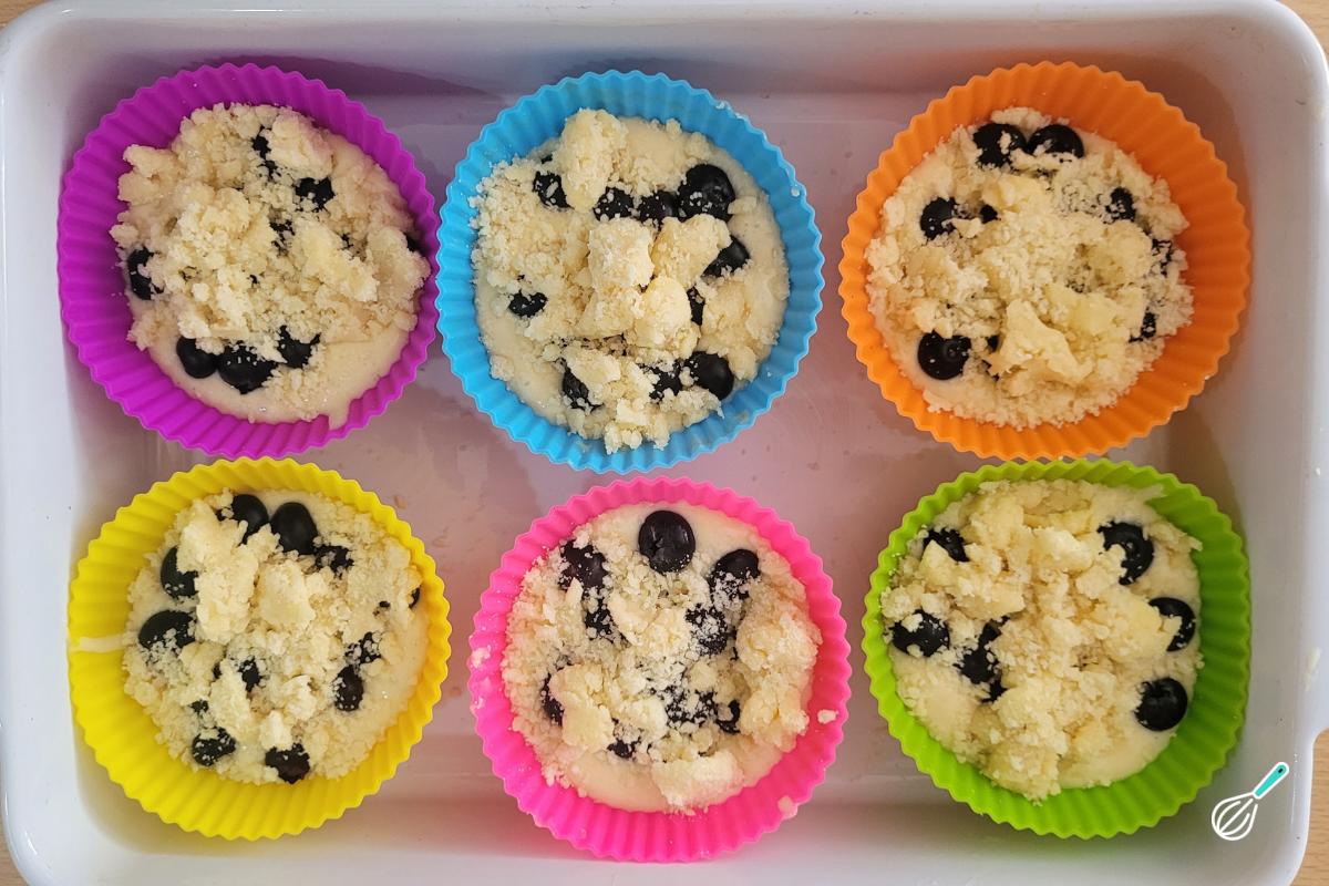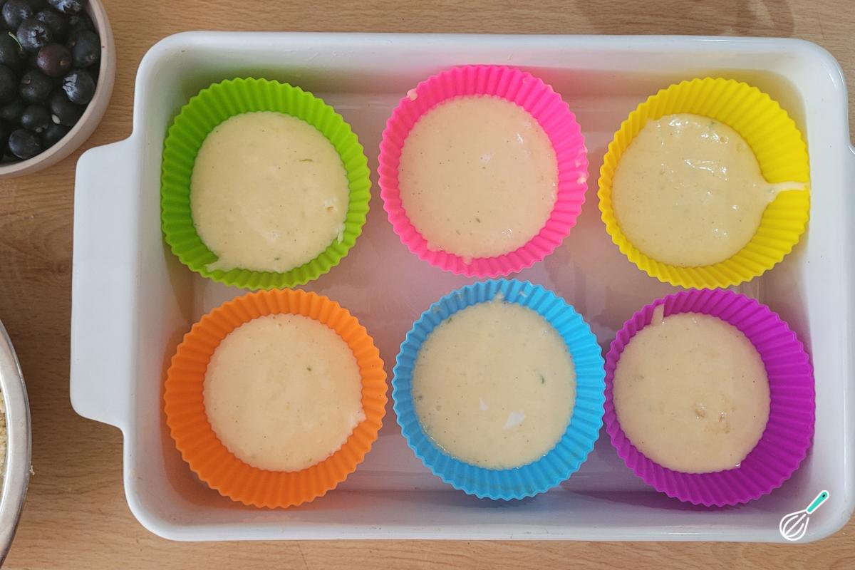 Distribua a massa nas forminhas sem encher até o final, porque ainda vamos adicionar os blueberries e a farofinha crocante e a massa ainda vai crescer no forno.