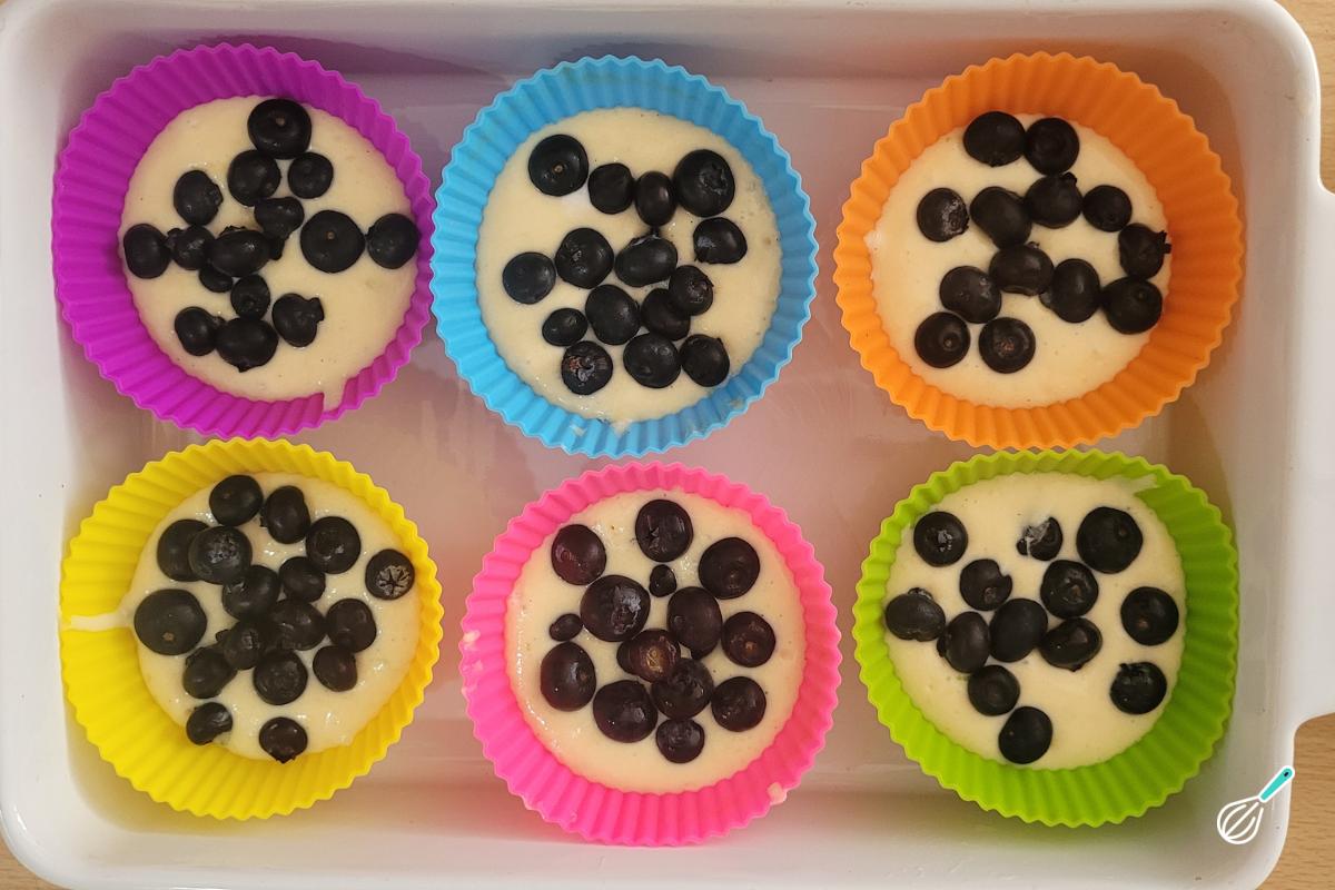 Distribua os mirtilos igualmente nas forminhas. Você até pode misturar as blueberries diretamente na massa antes de colocar nas forminhas, mas às vezes elas afundam demais e a massa acaba ficando muito úmida no fundo.
