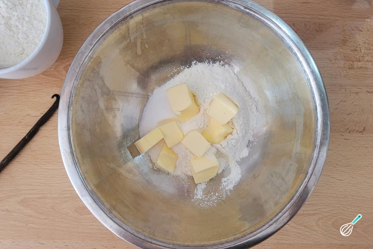 Vamos começar preparando a farofa que vai por cima. Assim, quando a massa estiver pronta, basta jogar a farofa por cima e levar pro forno. Em uma tigela, misture a farinha e o açúcar e adicione a manteiga gelada em cubos.