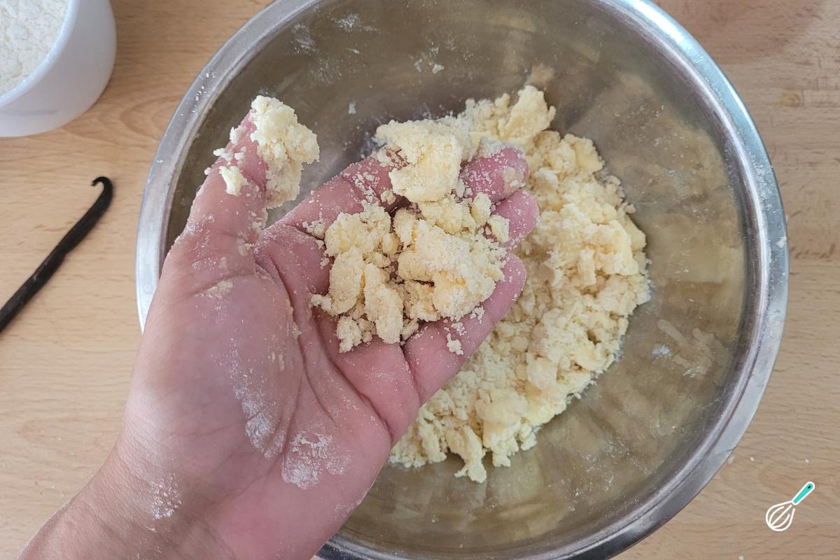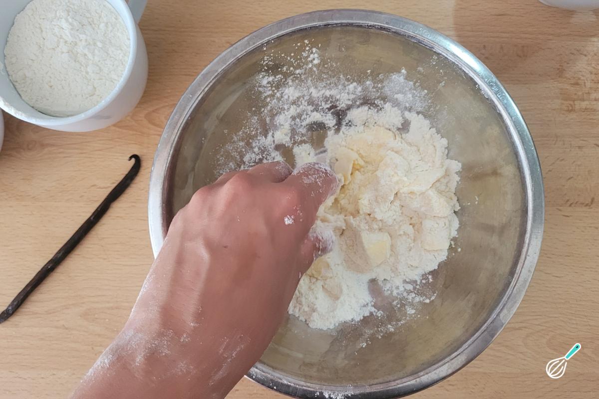 Com a ponta dos dedos, vá quebrando os pedacinhos de manteiga, sem desfazer demais.