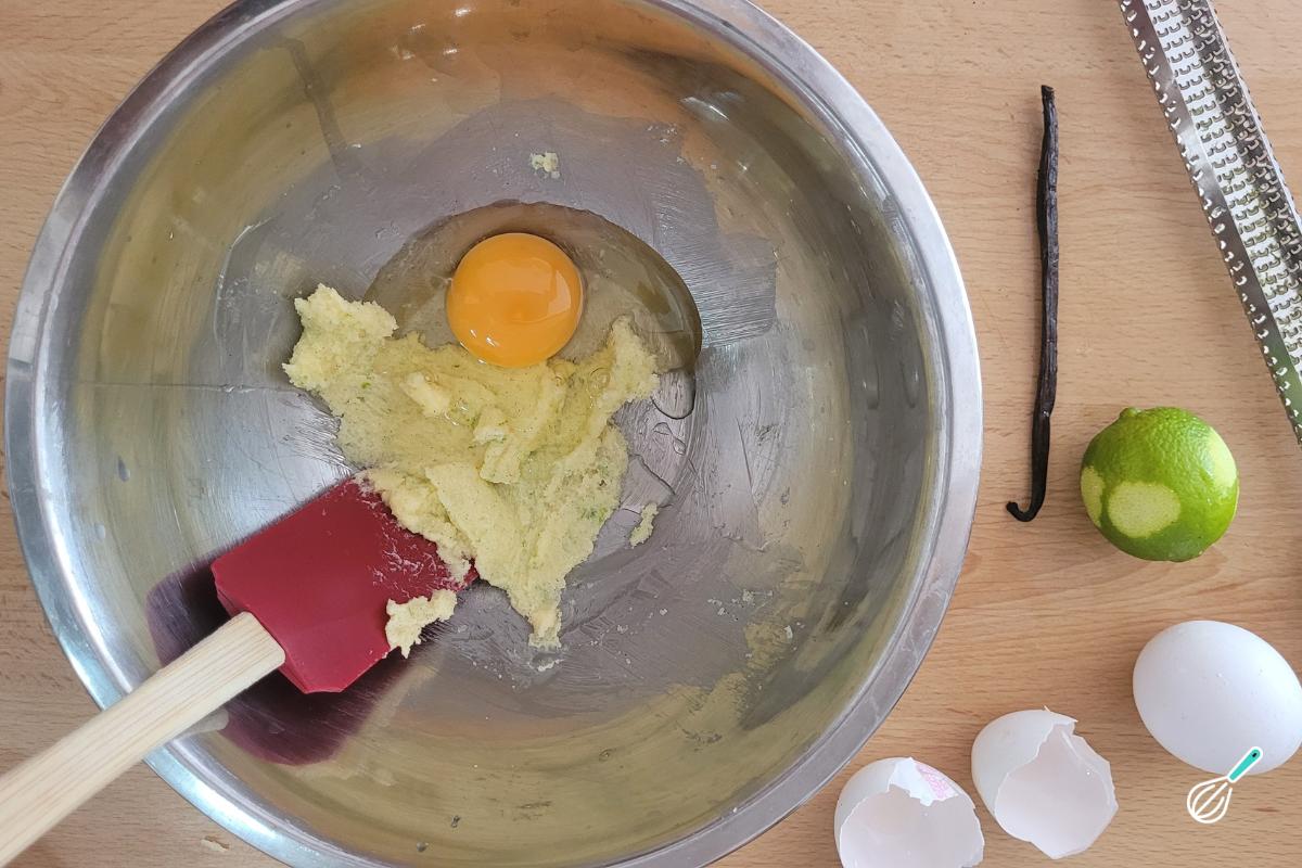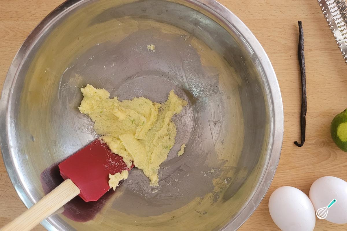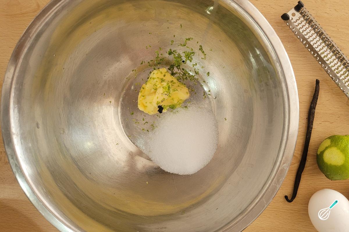Em outra tigela, adicione a manteiga, o açúcar, as raspas de limão e a baunilha (ou extrato de baunilha).
