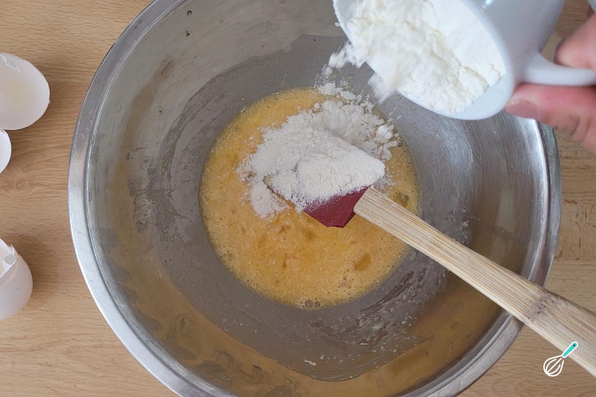 Adicione a farinha de trigo aos poucos e vá misturando para incorporar até não ter mais nenhum gruminho. Evite bater demais para não desenvolver o glúten e evitar que a massa fique pesada.