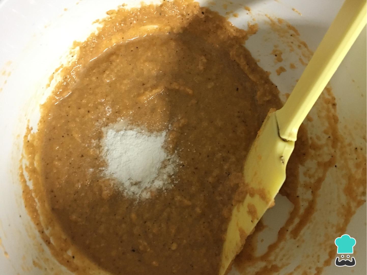 Em um recipiente coloque a farinha e o xylitol. Junte a mistura do liquidificador, misture, e por fim coloque o fermento.