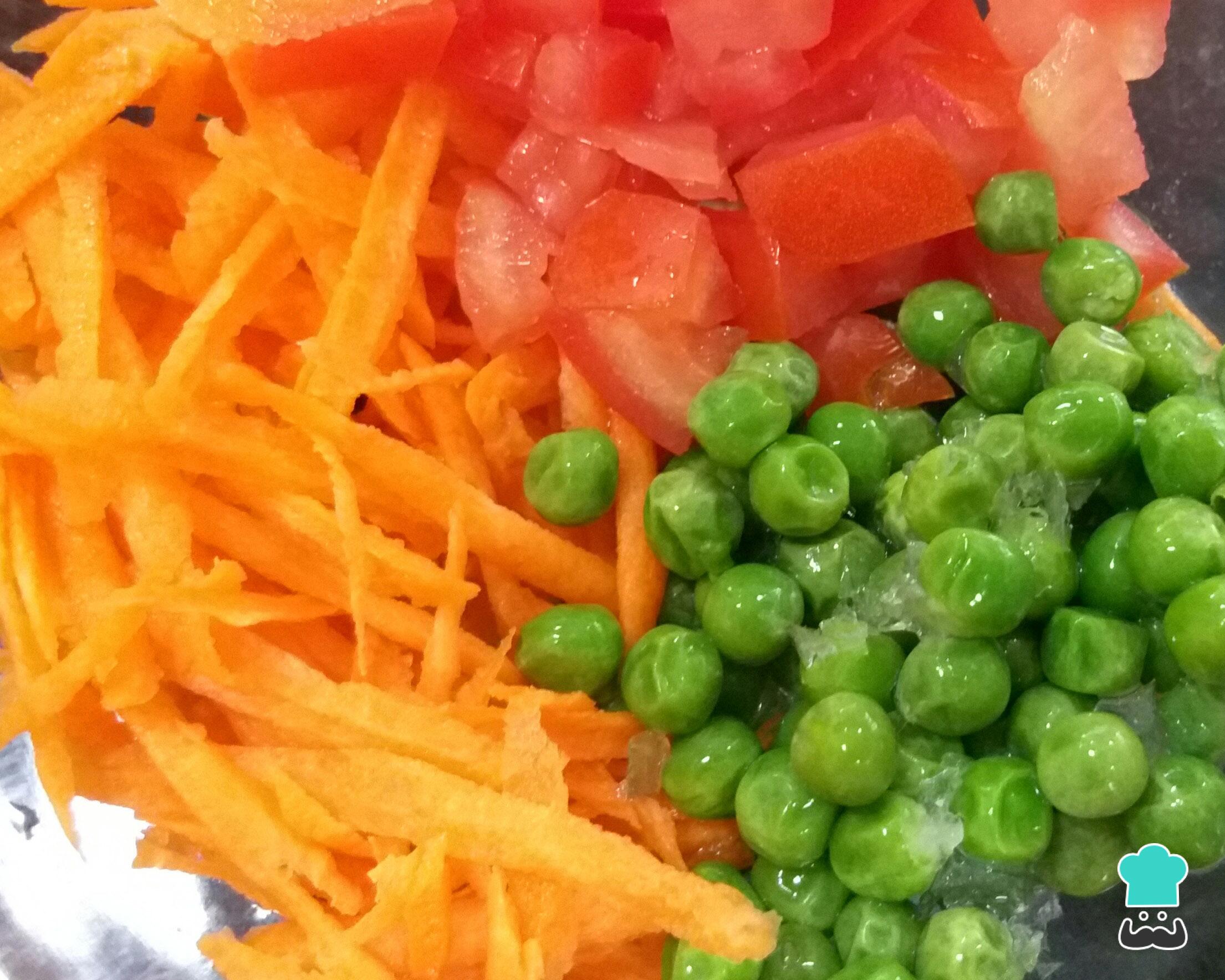 Prepare o recheio: rale a cenoura, pique o tomate e descongele as ervilhas frescas. Reserve.