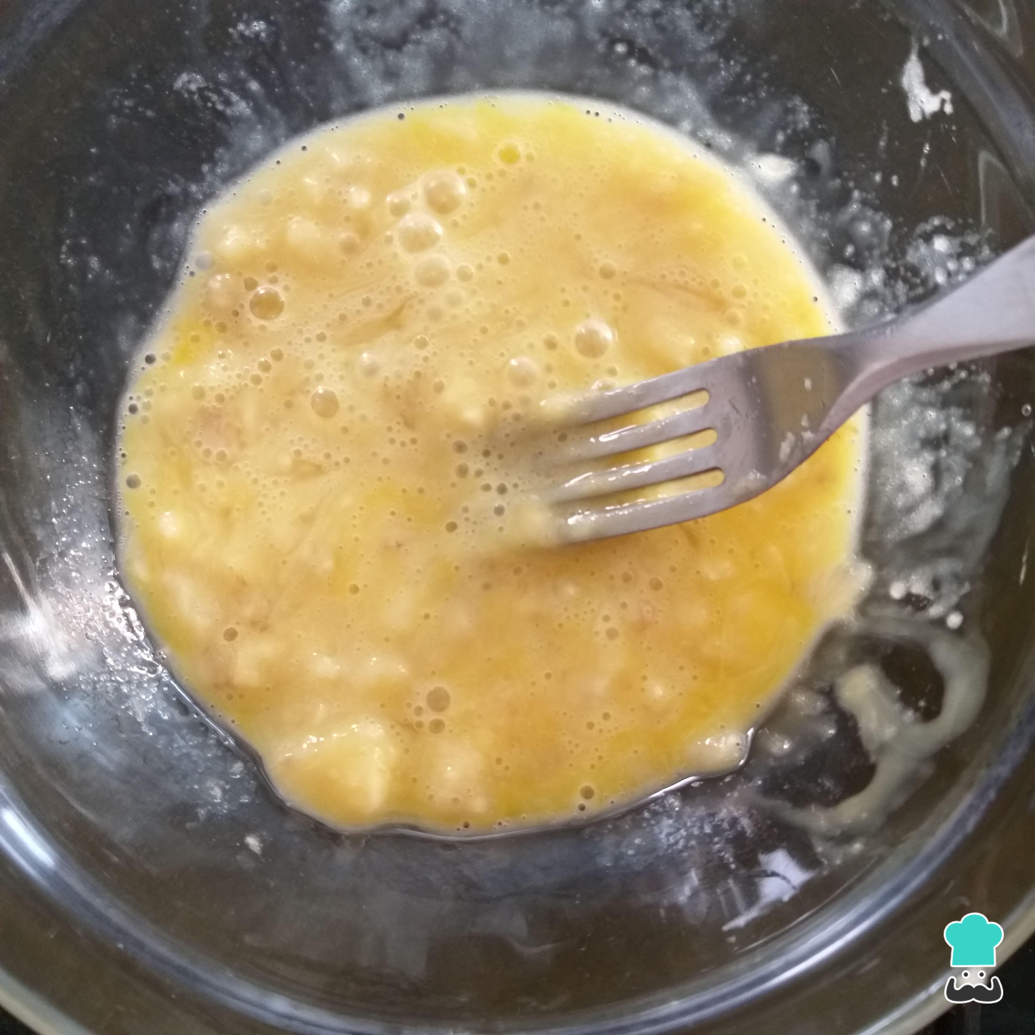 Descasque a banana e amasse a banana com um garfo. Acrescente o ovo e misture bem com um garfo.
