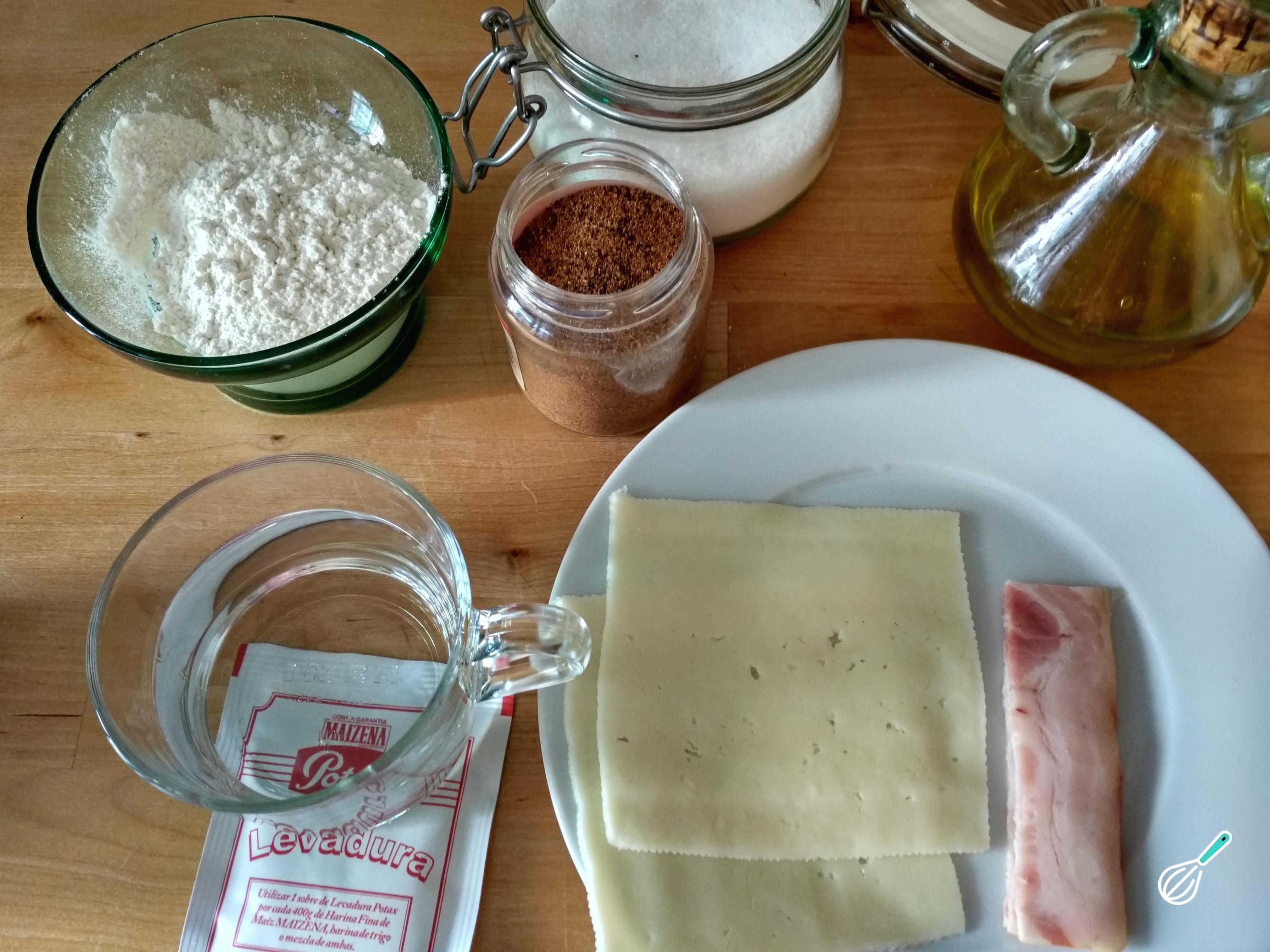Comece por reunir todos os ingredientes para preparar este muffin salgado fácil com bacon e queijo.