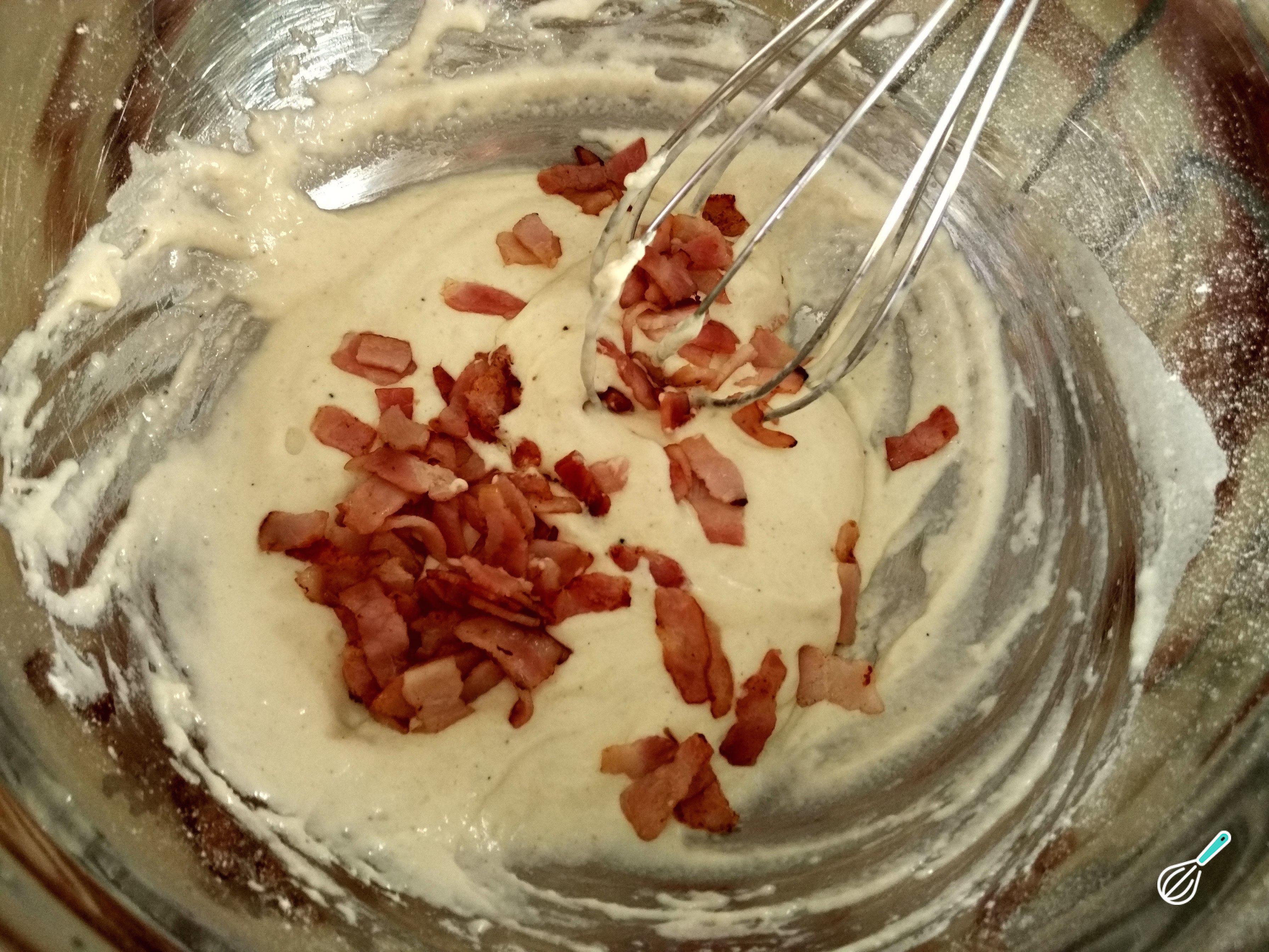 Em seguida, adicione o azeite de oliva e continue mexendo com o fouet até integrar tudo por completo. Refogue o bacon cortado em tiras em uma frigideira até dourar e adicione-o à massa, junto com o queijo picado finamente.