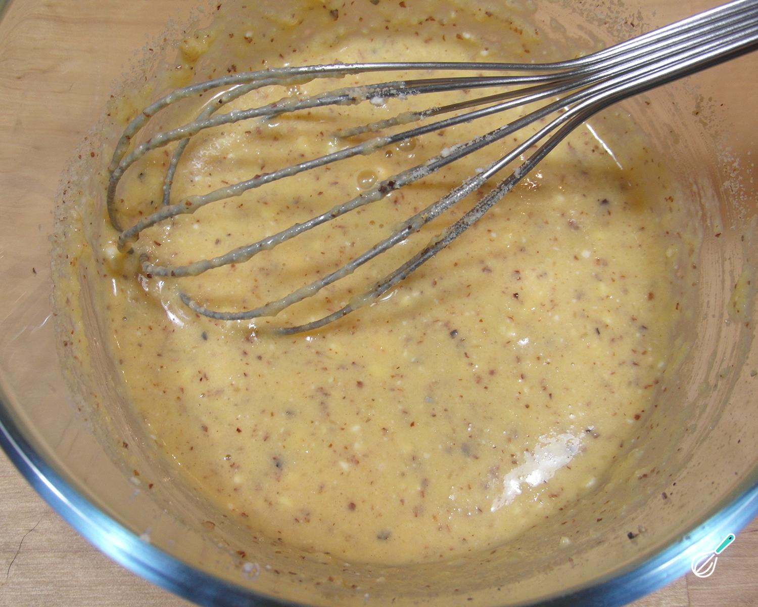 Num recipiente à parte prepare a massa destes muffins salgados paleo: bata os ovos com o leite ou bebida vegetal e o azeite ou manteiga e acrescente a farinha de amêndoas. Tempere com sal e pimenta.