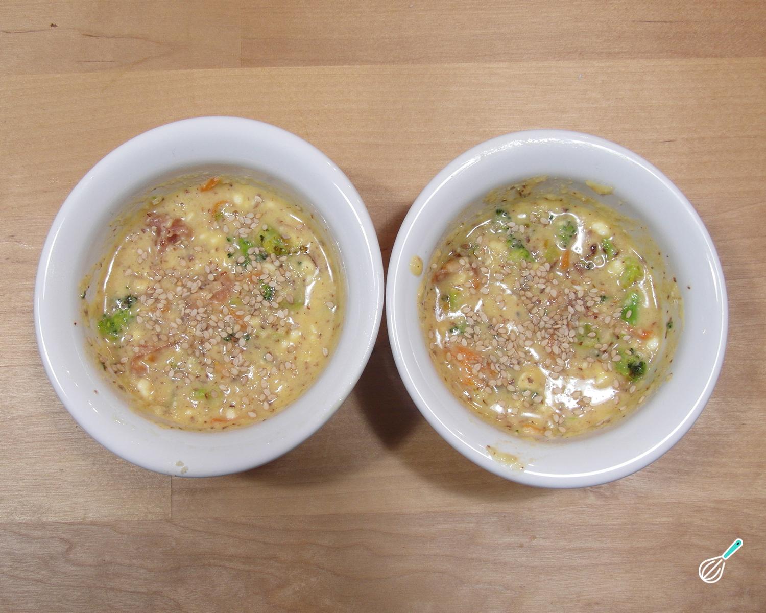 Adicione os legumes e o presunto em pedaços à massa e distribua por forminhas de muffin ou ramekins muito bem untados, para que seja fácil desenformar. Se quiser polvilhe um pouco de gergelim e leve ao forno preaquecido a 180ºC por 20-25 minutos.