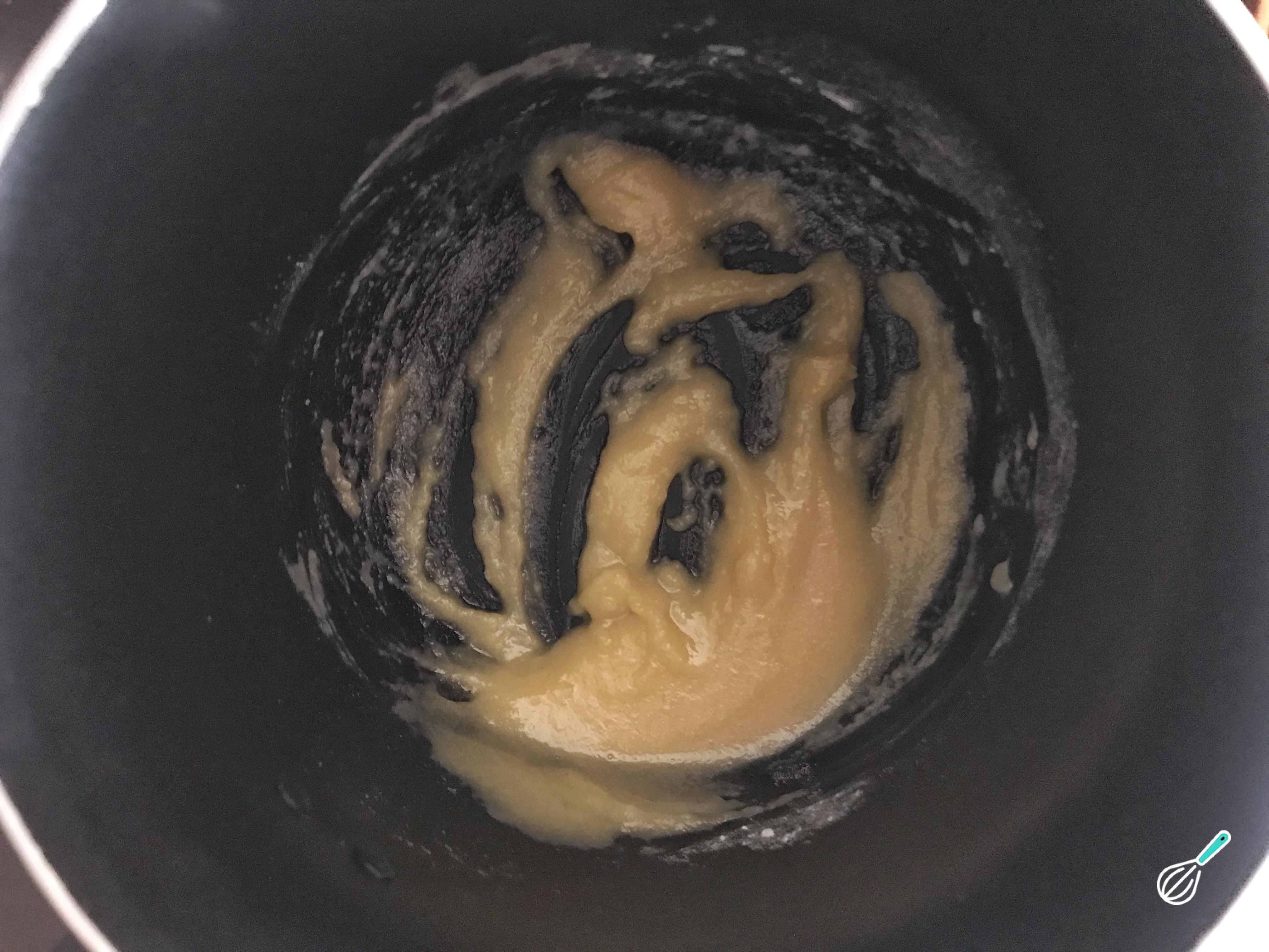 O primeiro passo para fazer esta receita de muffin saudável é preparar o molho branco. Para fazer isso, misture a manteiga e a farinha em uma panela. Leve ao fogo médio até o preparado começar a tostar.