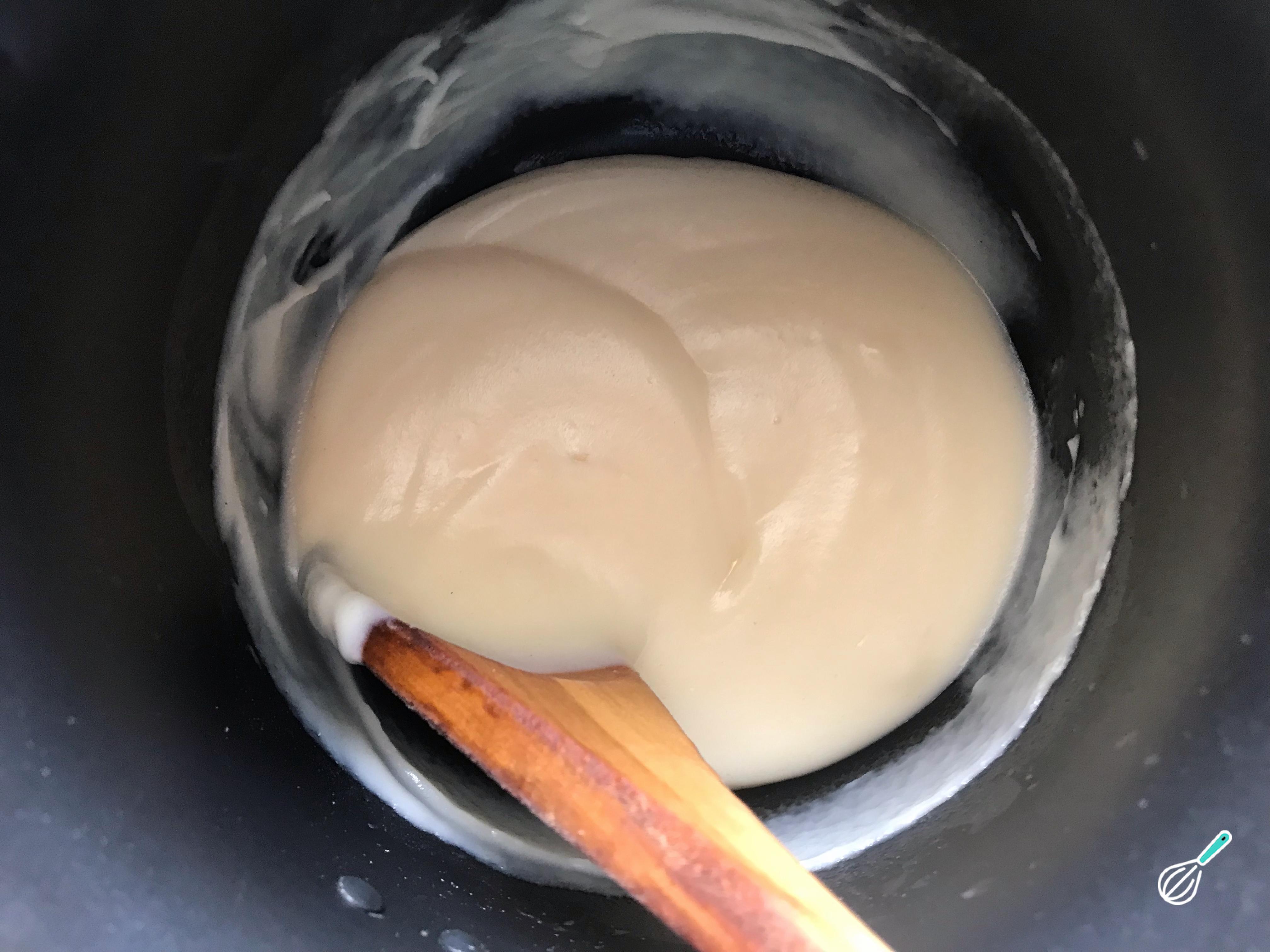 Quando a farinha e a manteiga estiverem ligeiramente mais marrons e cremosas, acrescente o leite frio. Leve o molho ao fogo e continue mexendo até engrossar. reserve