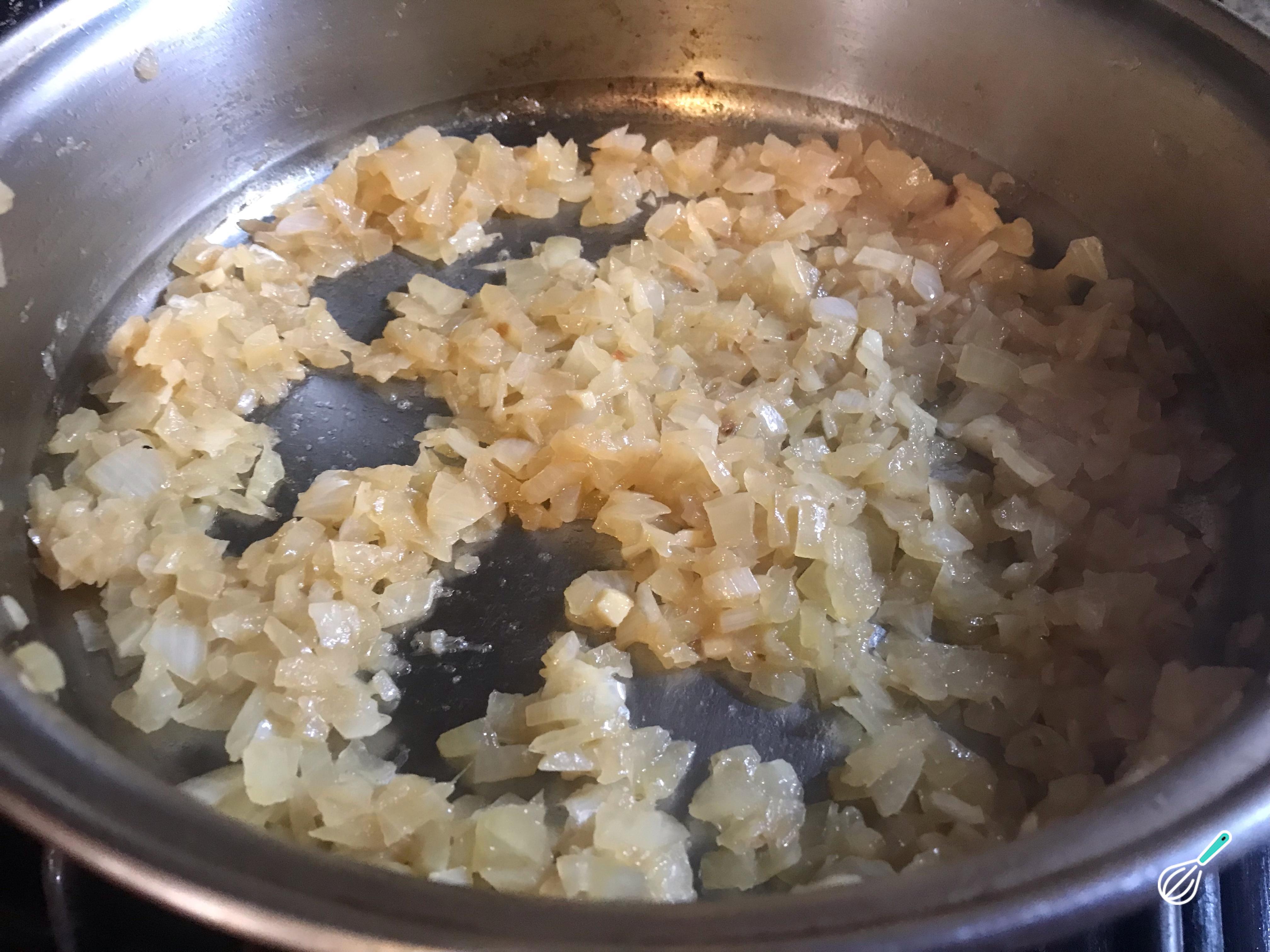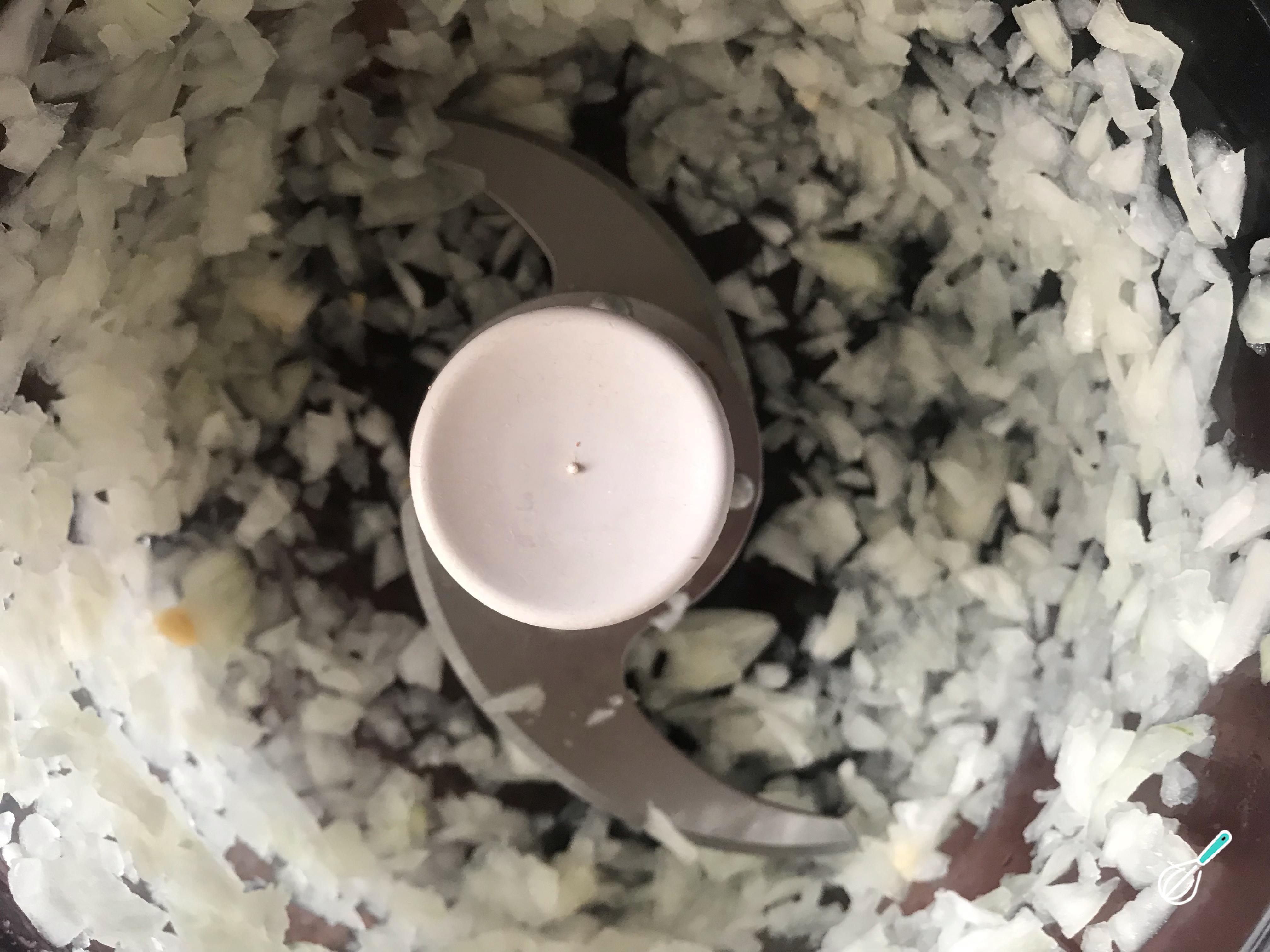 Por outro lado, descasque e processe a cebola enquanto aquece uma panela com 1 colher de chá de óleo. Reserve a cebola.