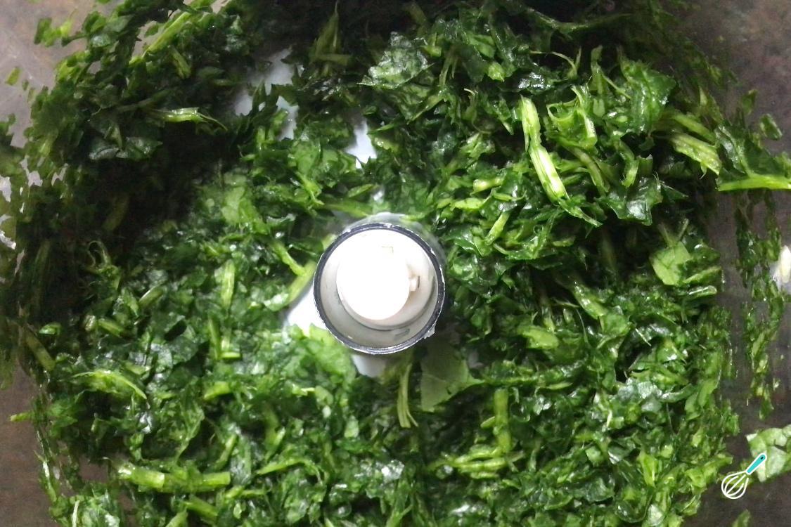 Enquanto isso, processe as folhas de espinafre com o tamanho que você preferir. E, se não tiver processador, pode picá-los bem fininho ou refogar para que fiquem macios e bem misturados ao recheio.