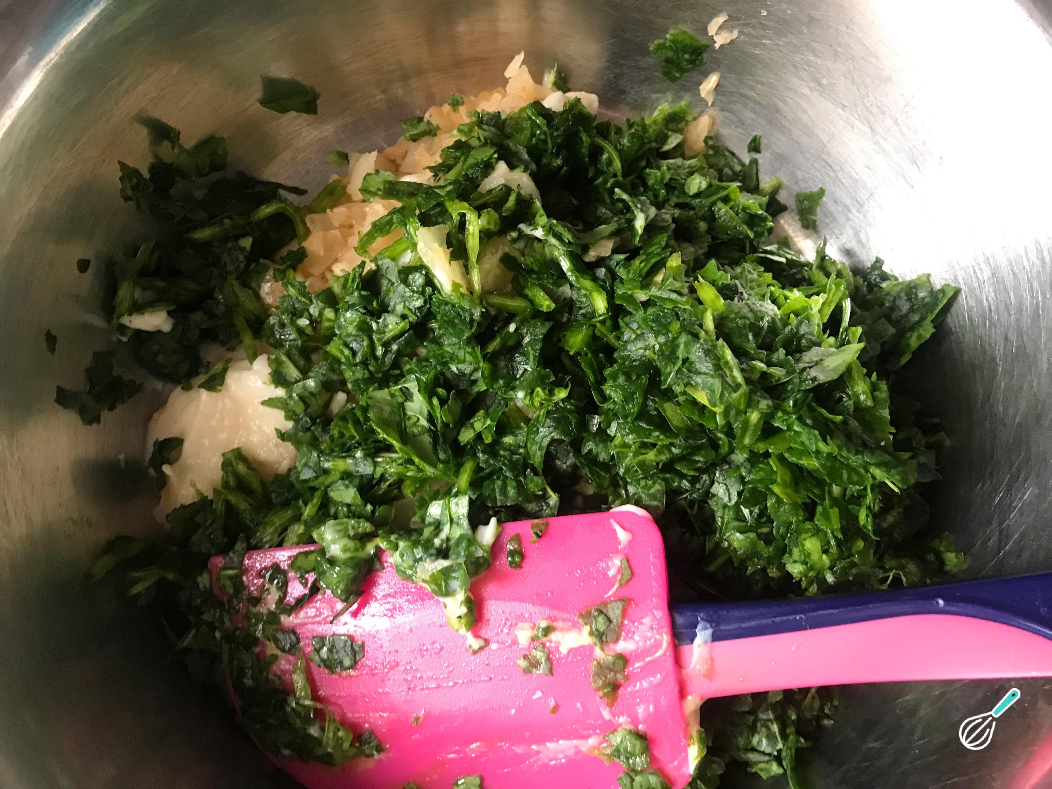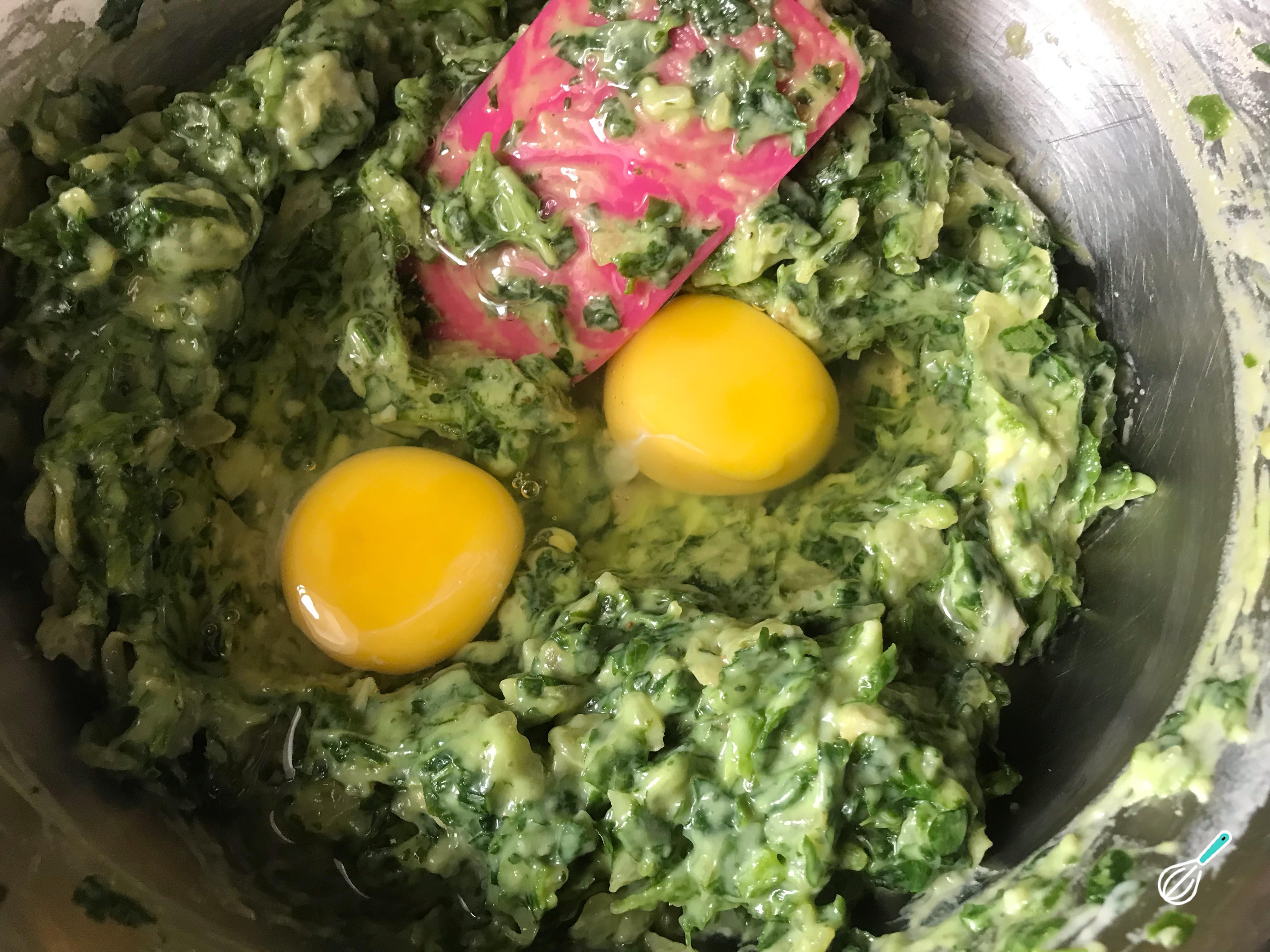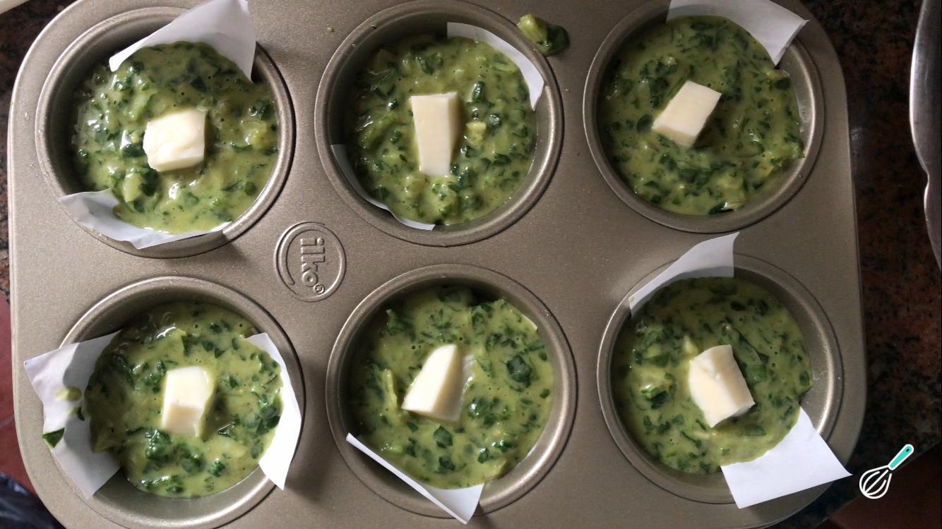 Misture o espinafre processado com a cebola refogada, o molho branco e os temperos. Prove sua mistura de muffin saudável e corrija o sal, se necessário.