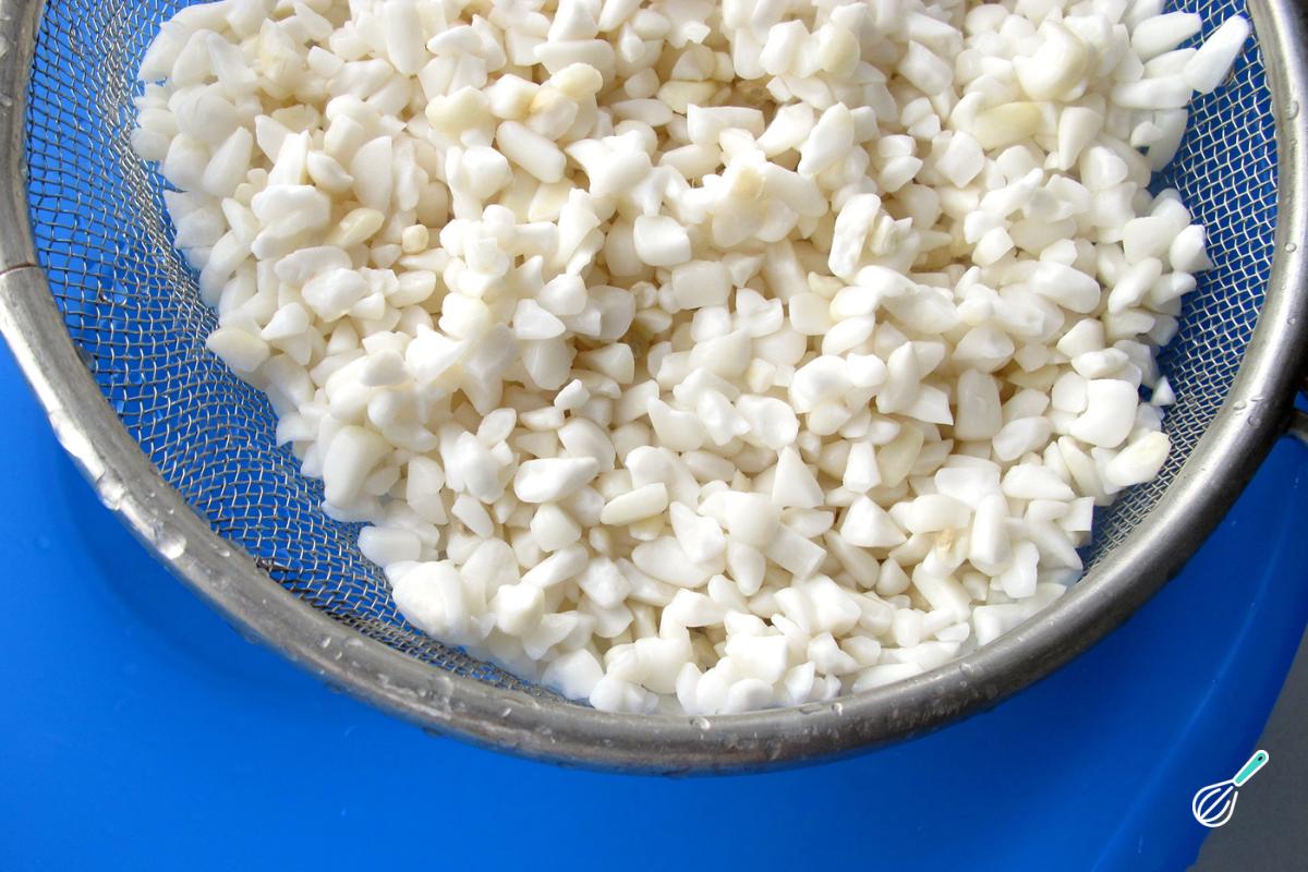 Dica: É importante não pular este passo de deixar o milho de molho para não correr o risco do seu mungunzá doce ficar duro!