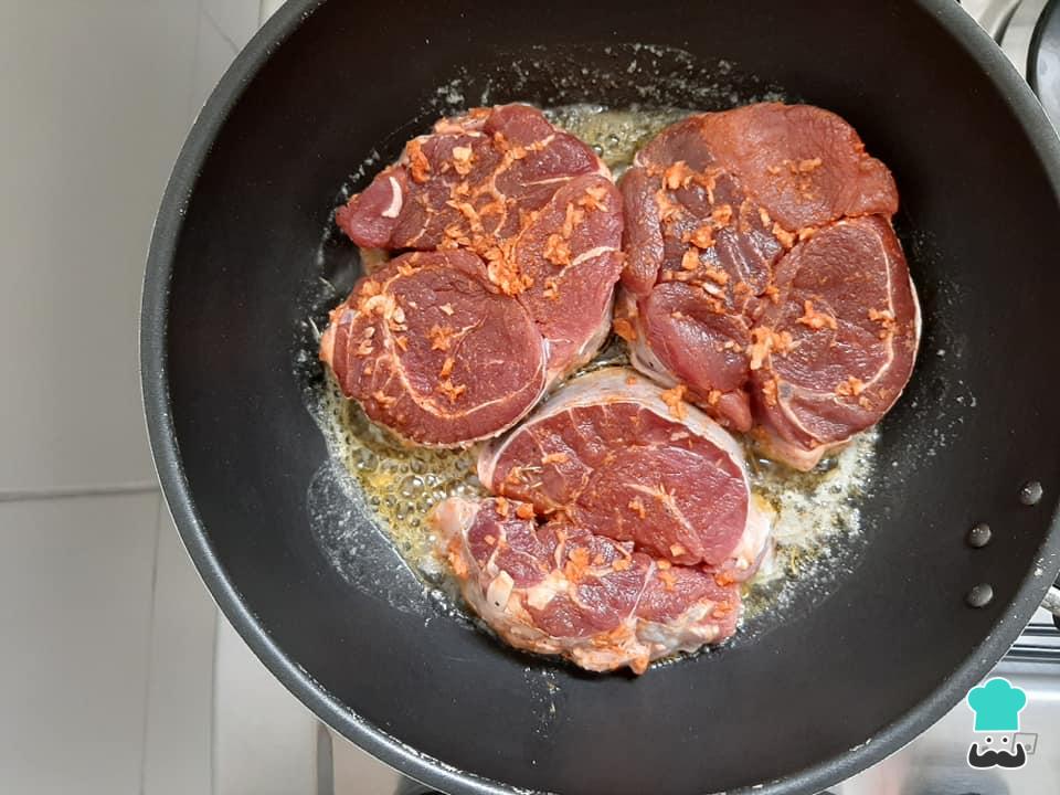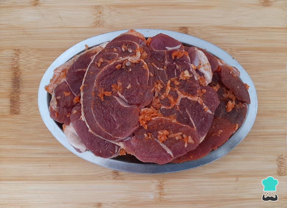 Tempere o músculo com sal, pimenta do reino, páprica e alho amassados e deixe a carne descansar neste tempero por pelo menos 1 hora antes de começar a assar.