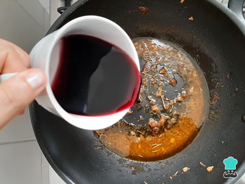 Na frigideira que foi usada para selar a carne, regue com o vinho e deixe-o reduzindo por uns 5 minutos aproximadamente.