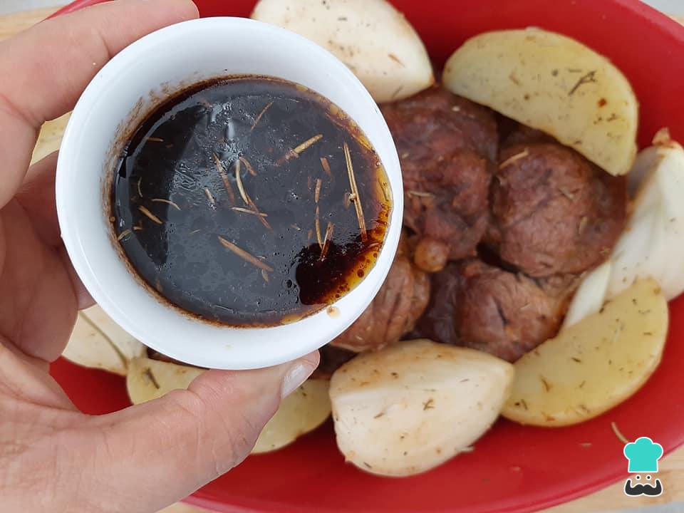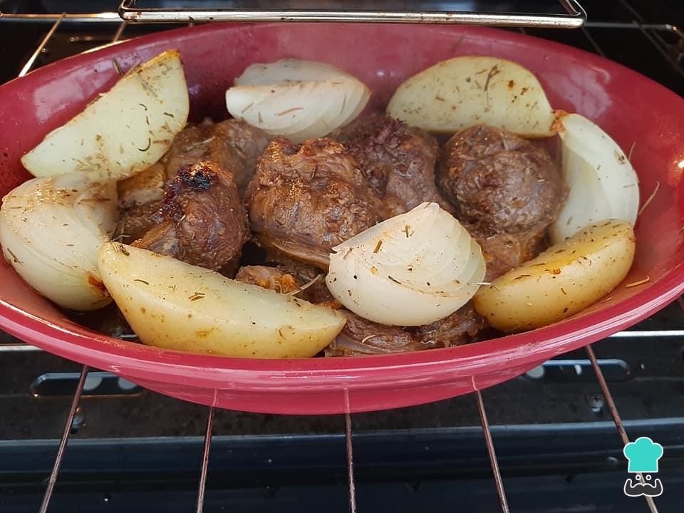 Distribua o molho sobre os pedaços de músculo e acomode as batatas e as cebolas ao lado da carne.