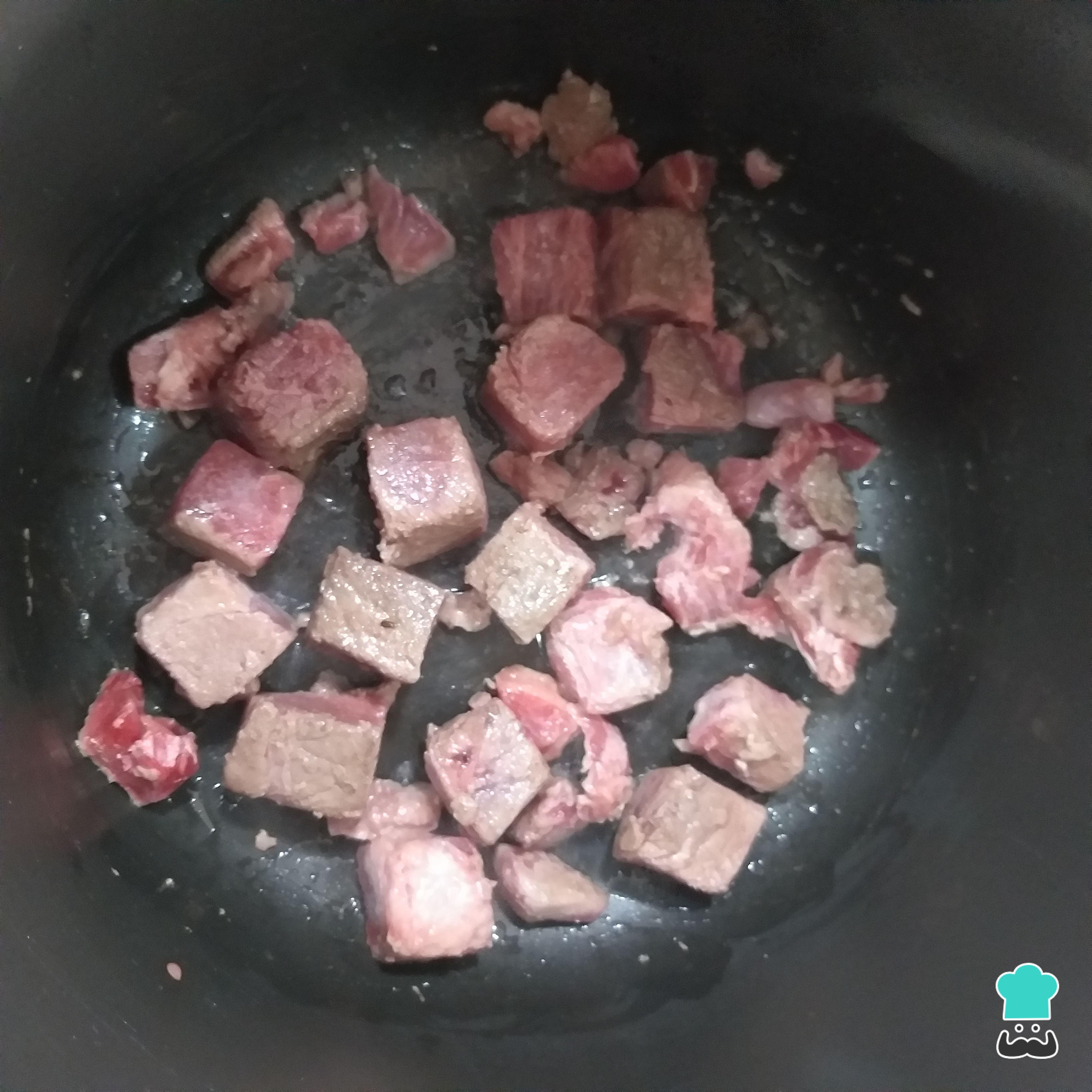 Corte o músculo bovino em cubos e coloque na panela de pressão com o óleo. Leve ao fogo médio e, sem tampar, deixe a carne fritar e dourar de todos os lados, para selar (esse é um truque para que se mantenha suculenta).
