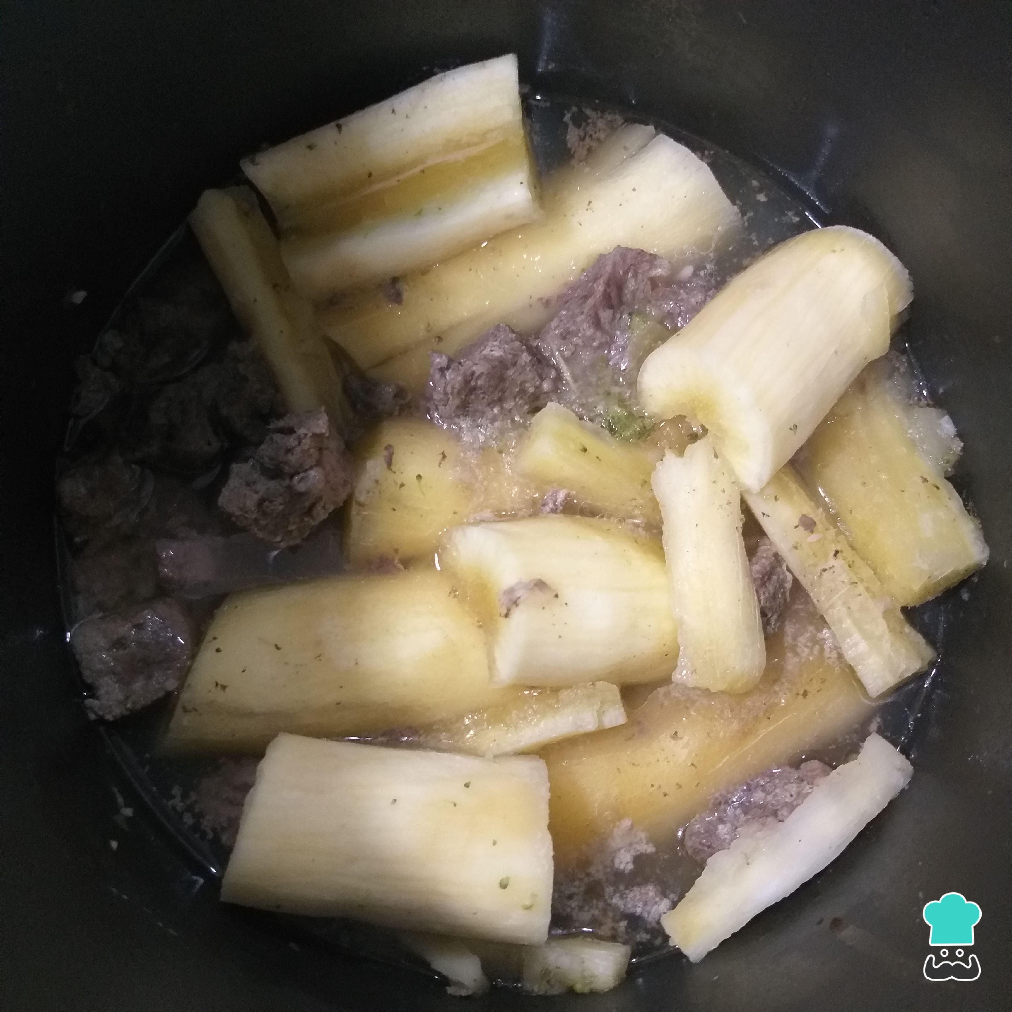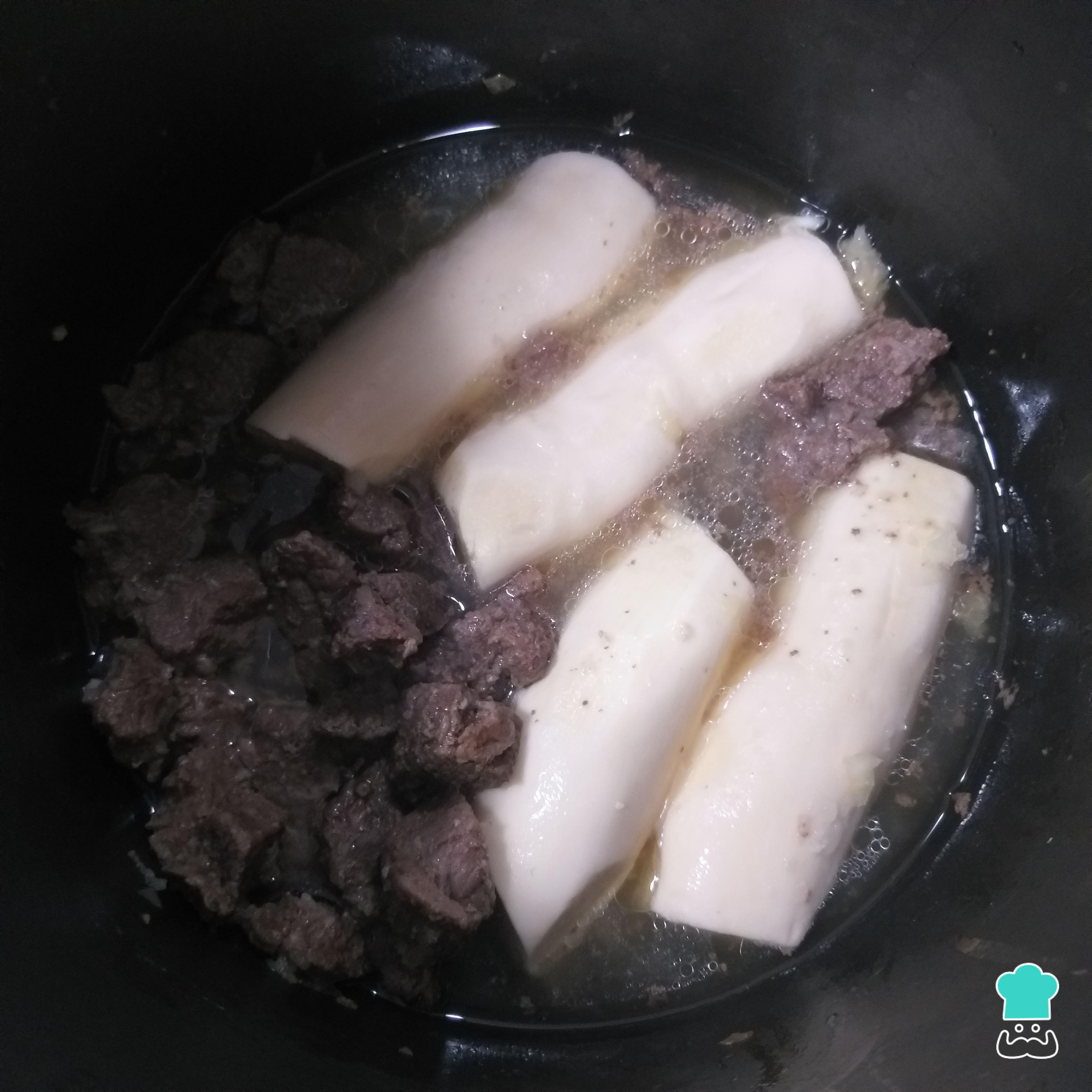 Acrescente a água, tampe e deixe o músculo cozinhar por 20 minutos, após começar a chiar. No fim desse tempo espere sair a pressão, abra a panela e coloque a mandioca descascada (se necessário, acrescente também um pouco mais de água). Cozinhe por mais 20 minutos na pressão após a panela chiar.