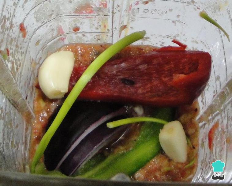 Lave os pimentões e o alho poró e descasque a cebola e os alhos. Bata no liquidificador metade dos pimentões com os dentes de alho, o alho-poró e a cebola picada, até conseguir um molho o mais liso possível.
