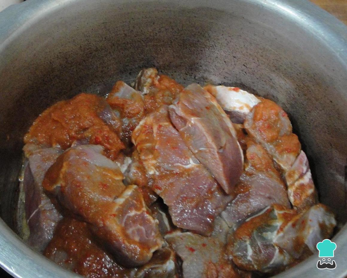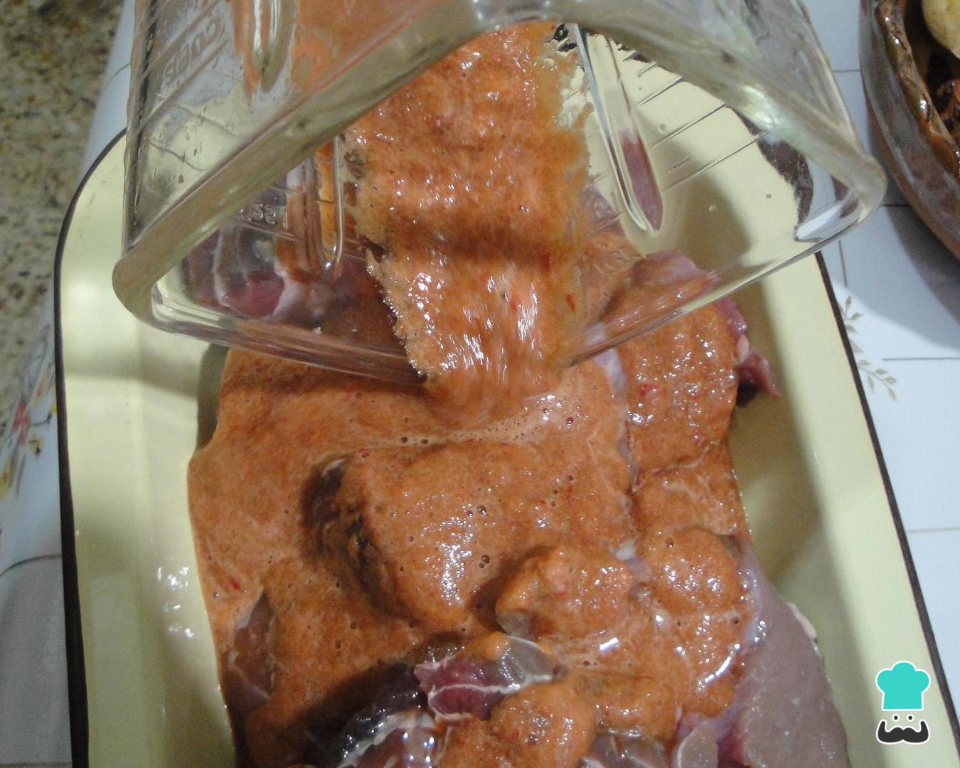 Corte a carne em pedaços e adicione-lhe os legumes batidos do passo anterior. Deixe marinar por, no mínimo, 2 horas na geladeira, deste jeito garantimos uma carne bem saborosa!