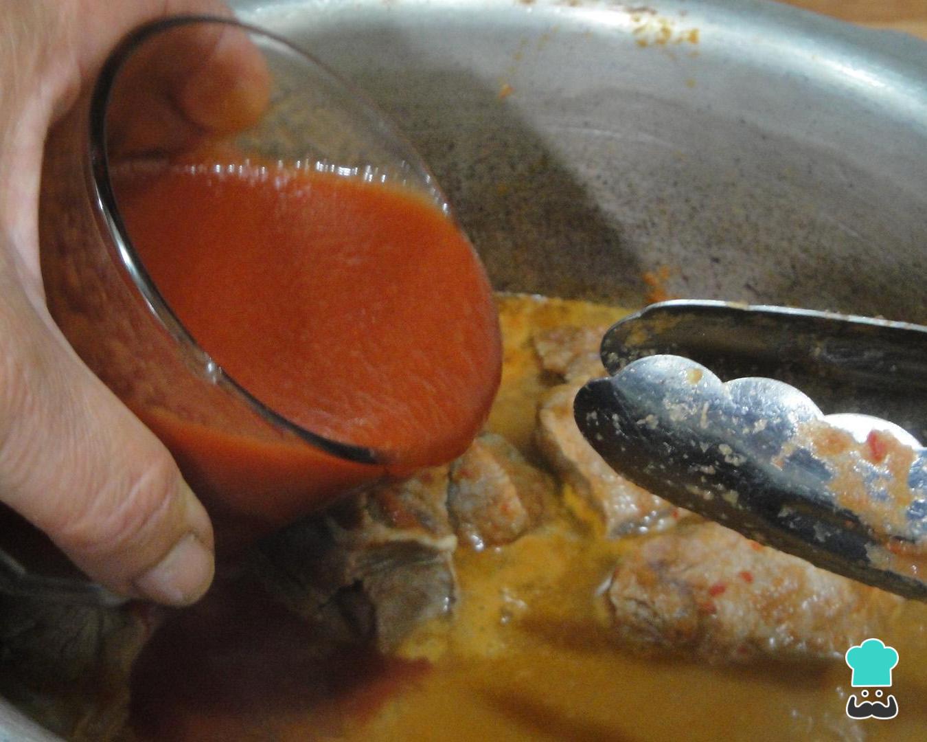 Acrescente o molho usado na marinada e também todos os restantes temperos e ingredientes: as metades de pimentão reservadas, o molho de tomate, o vinho ou cerveja, a água, o suco de laranja, as folhas de louro, o cominho, o orégano e sal a gosto. Tampe a panela e deixe cozinhar por 30 minutos.