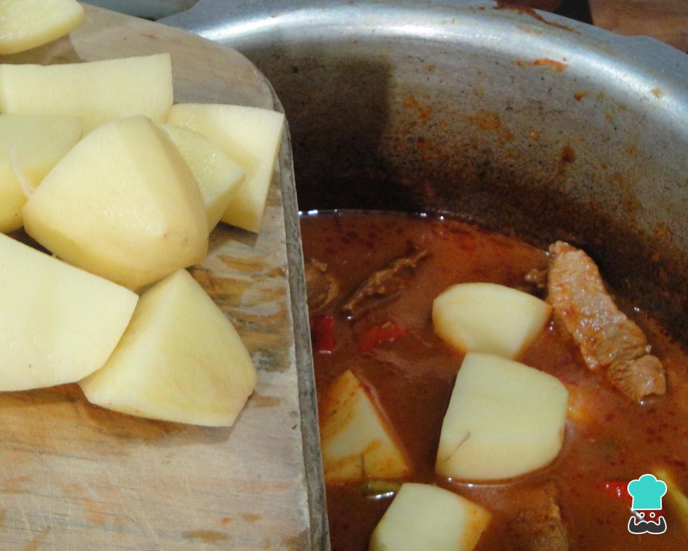 Após, desligue o fogo e deixe sair a pressão. Abra a panela, adicione as batatas descascadas e cortadas em cubos, tampe novamente e deixe cozinhar por mais 10-15 minutos ou até as batatas e a carne ficarem macias.
