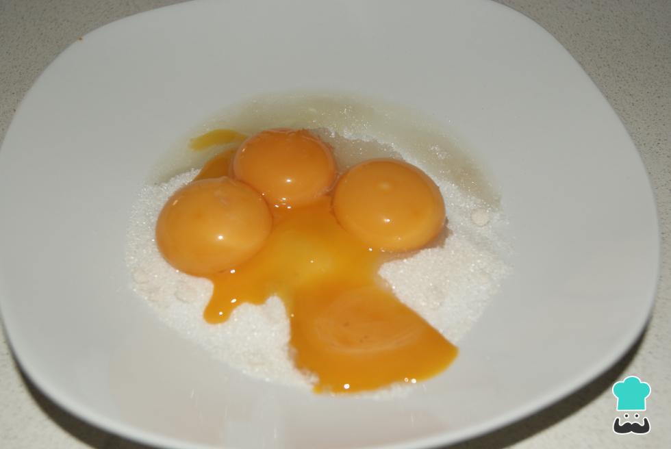 O passo seguinte é misturar as gemas de ovo com o açúcar baunilhado. Se não tiver esse ingrediente, pode usar açúcar refinado e algumas gotas de essência de baunilha.