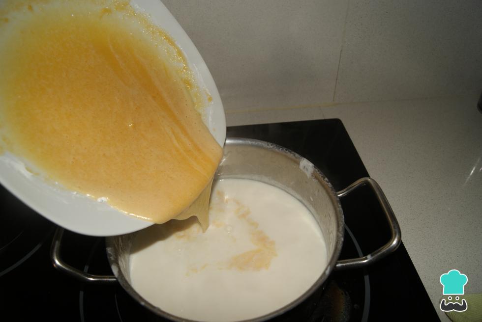 Junte a mistura de ovos ao leite morno e leve de novo ao fogo, para ferver. Fique mexendo para engrossar e evitar queimar.